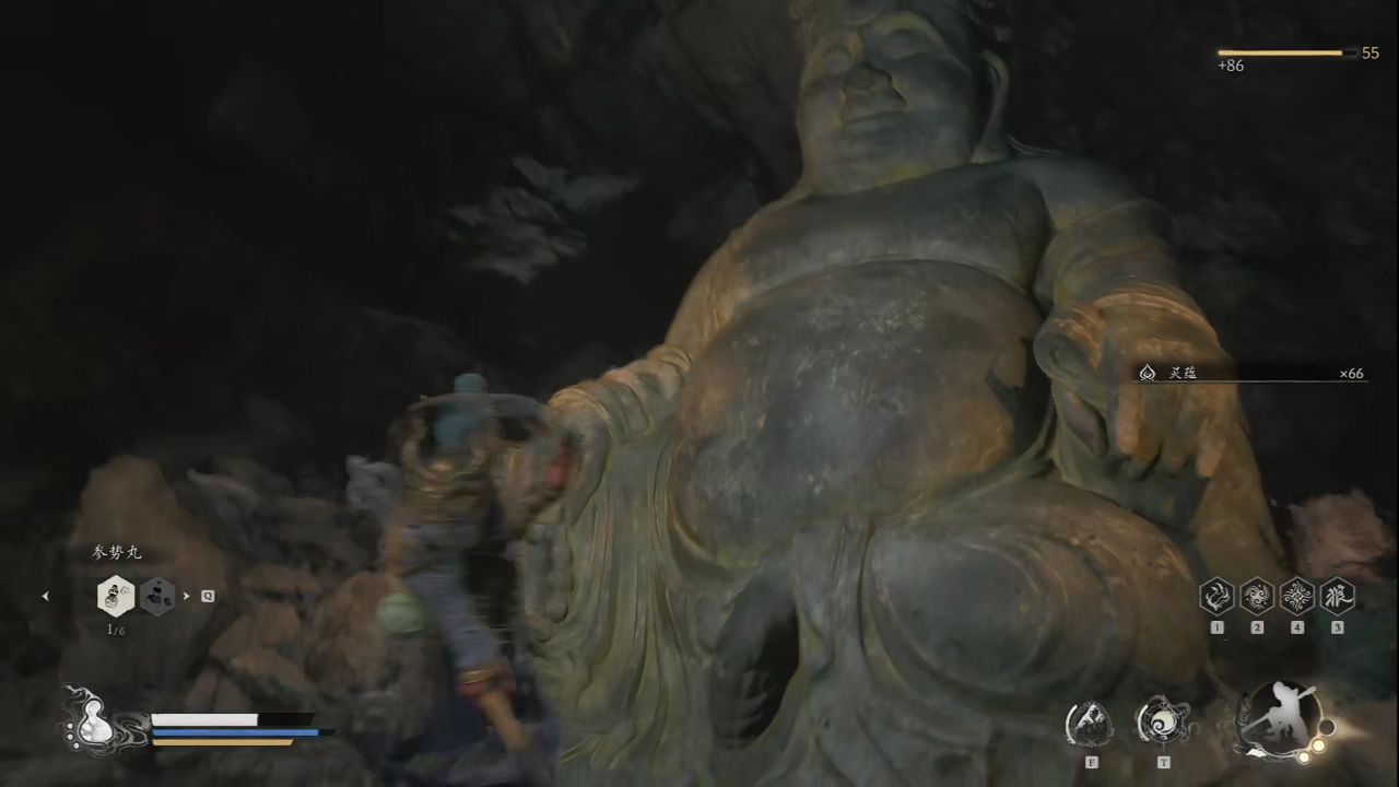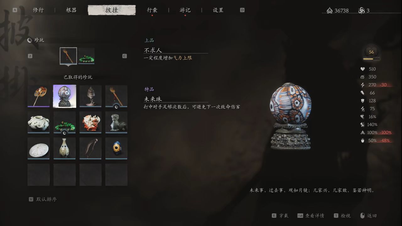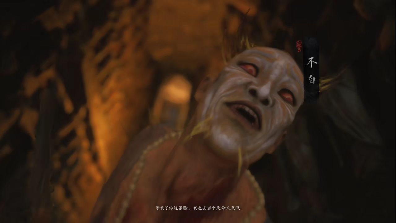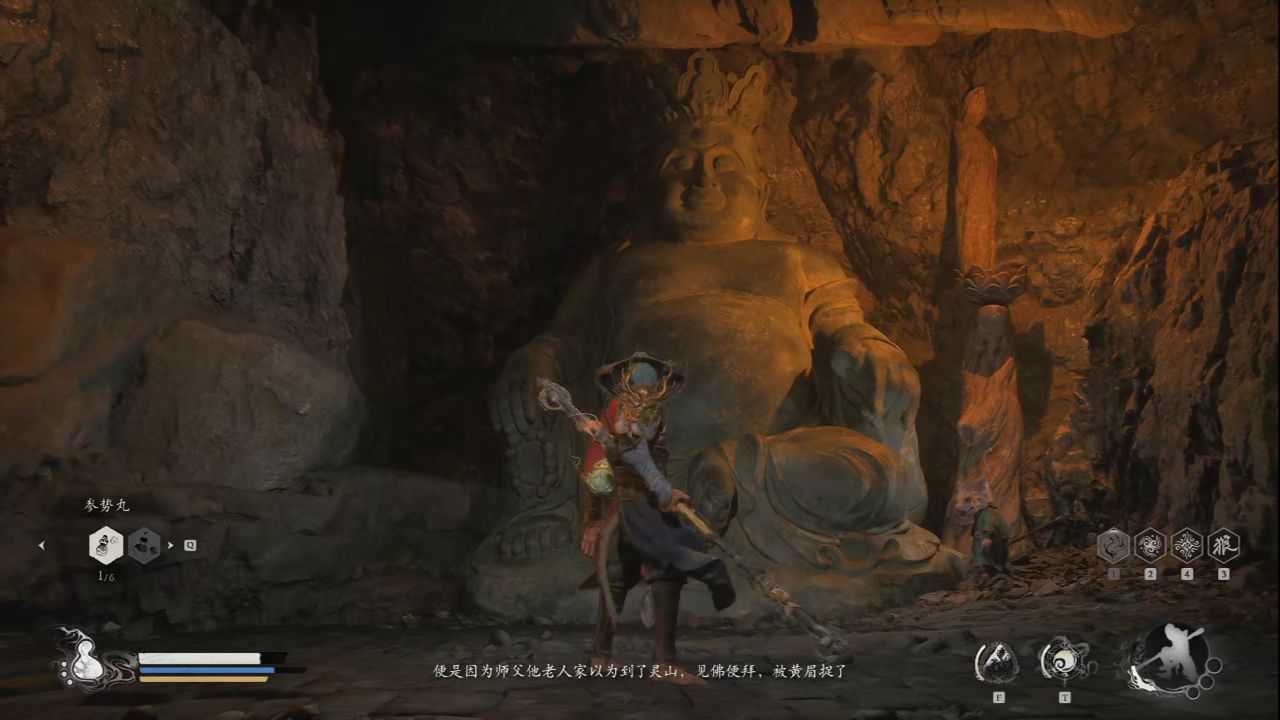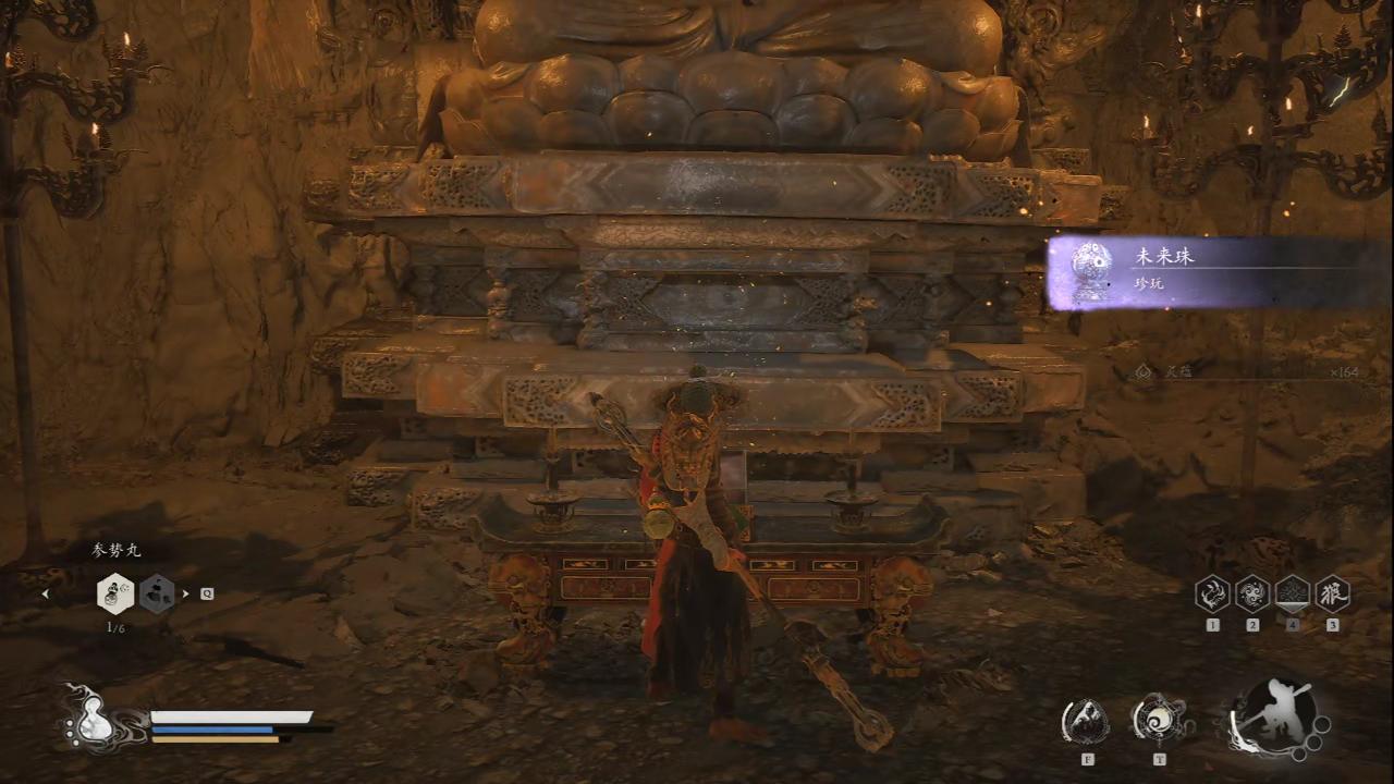 並且在一個臺階上我們能看到一隻穿衣服的老猴,他走後我們在佛像處能拿到要緊事物—想蘊,跳下平臺後遇到BOSS—不白,但是打到殘血他會逃跑。我們也不用原路返回,繼續往前走,穿過刻有佛像的狹長隧道,在一個山洞佛像供桌前拿到珍玩—未來珠,其詞條非常恐怖,能夠免疫致命傷害,務必裝上。