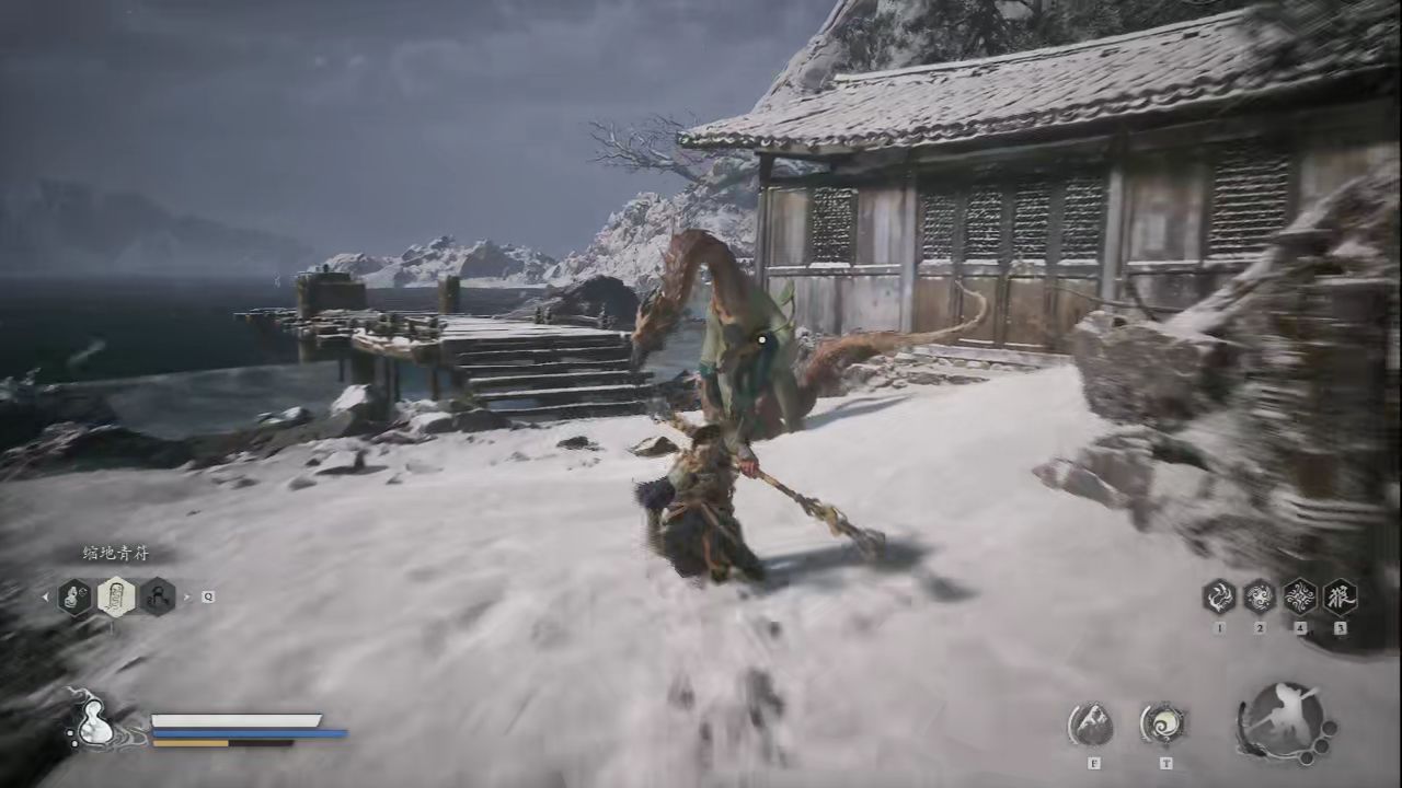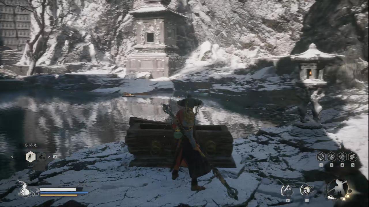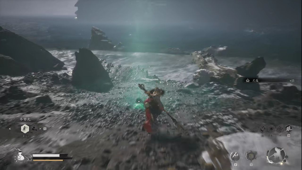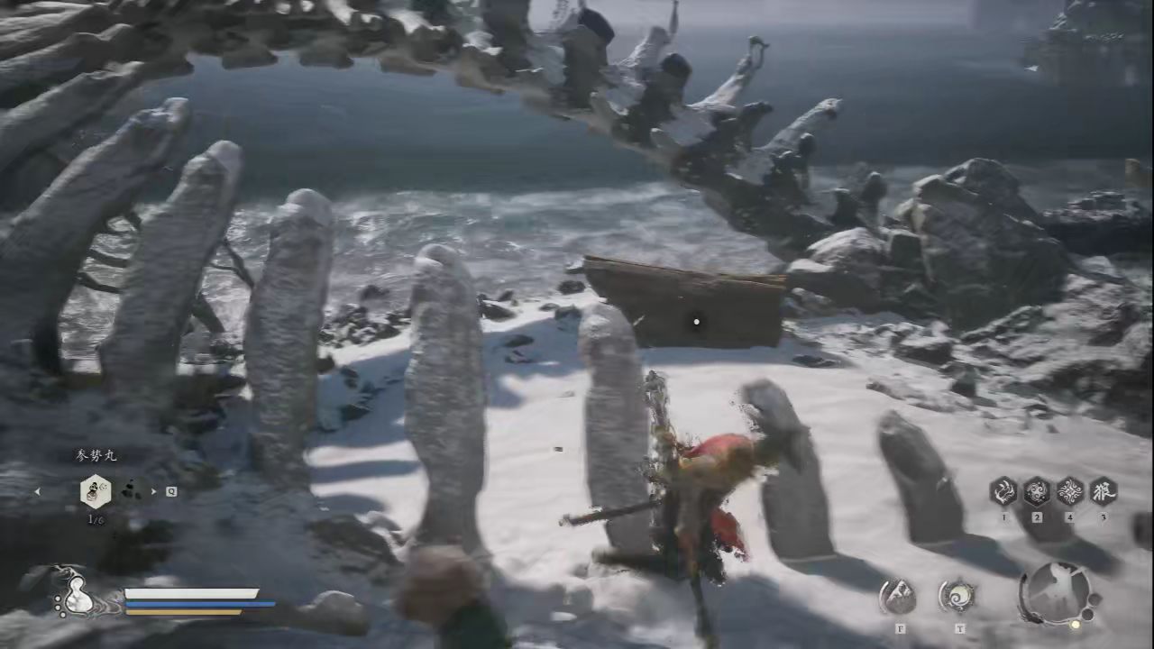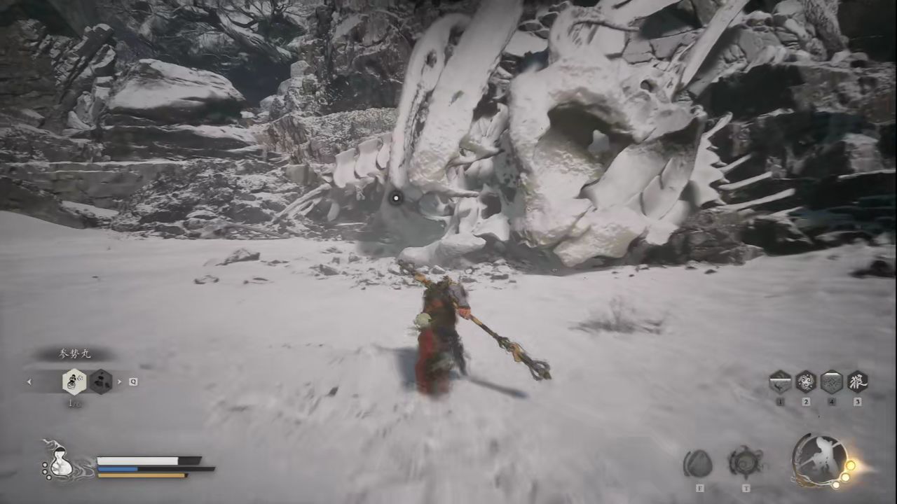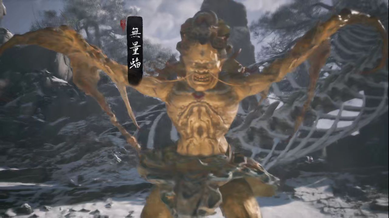 挑戰完寅虎後,我們回到苦海北岸,這次我們走右側海岸,在這裏我們能看見巨大的蛇骨,是龜蛇二將中蛇將的屍骨。靠海蛇骨處有一個寶箱,走到蛇頭骨位置,我們會遇到BOSS—無量蝠(一定要在八戒還在的時候過來,沒有八戒觸發不了,只能等二週目了),擊殺後與蛇頭骨互動,龜將會流出眼淚,我們先不着急去拿,繼續往右側山道走。
