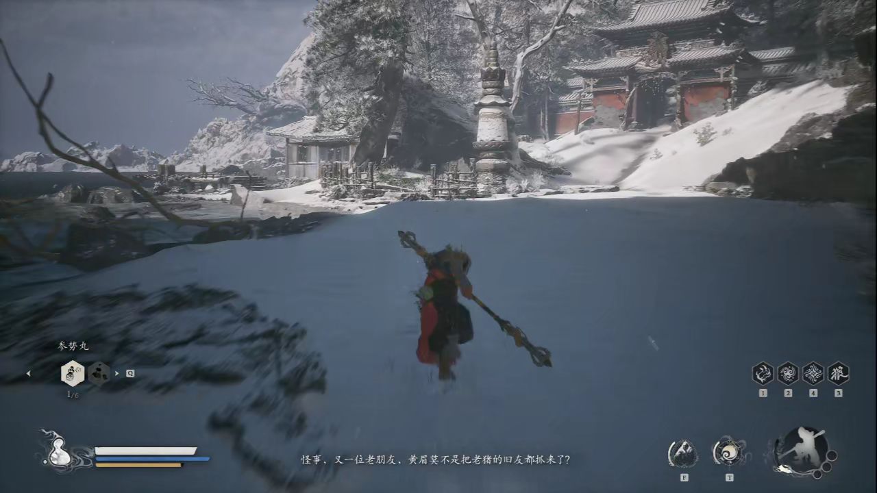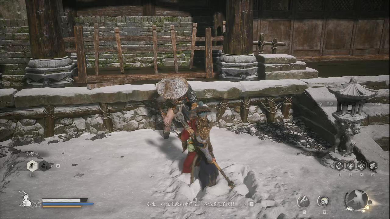 然後我們回到苦海北岸,先不要交任務,我們直接往一旁廟裏面走,之後能看見被三個怪圍毆的翠笠武師,我們打完怪後與他對話,便能開始隱藏任務—瓜田,也就是獲得禁字法是打黃眉的重要手段。對話完後我們往右側走,在湖邊有個寶箱,在湖中心有一瓶酒藍橋風月,能裝備三個泡酒物,並且喝一口能增加移速是跑圖用的好東西。