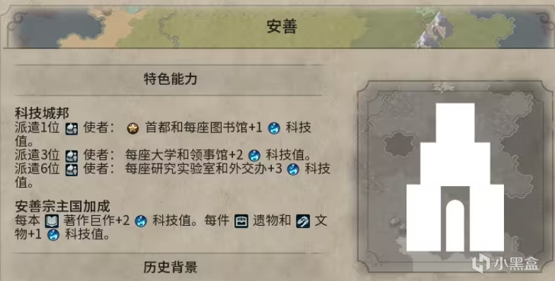 安善宗主国加成:每本著作巨作+2科技值。每件遗物和文物+1科技值。