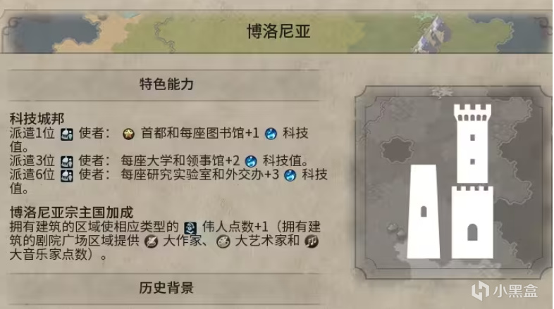 博洛尼亚的独特之处在于其提供的强力加成,拥有建筑的区域使相应类型的伟人点数+1(拥有建筑的剧院广场区域提供大作家、大艺术家和大音乐家点数)。