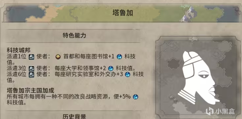 塔鲁加宗主国加成:所有城市每拥有一种不同的改良战略资源,便+5%科技值。