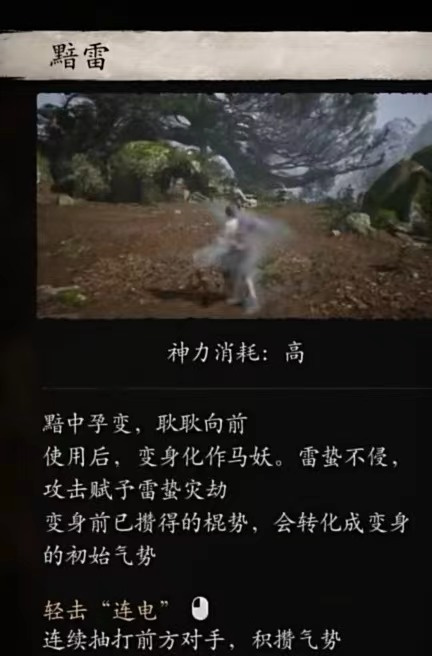 法术“黯雷”不仅威力强大,还能让悟空化身为马妖,增添战斗的多样性和趣味性。