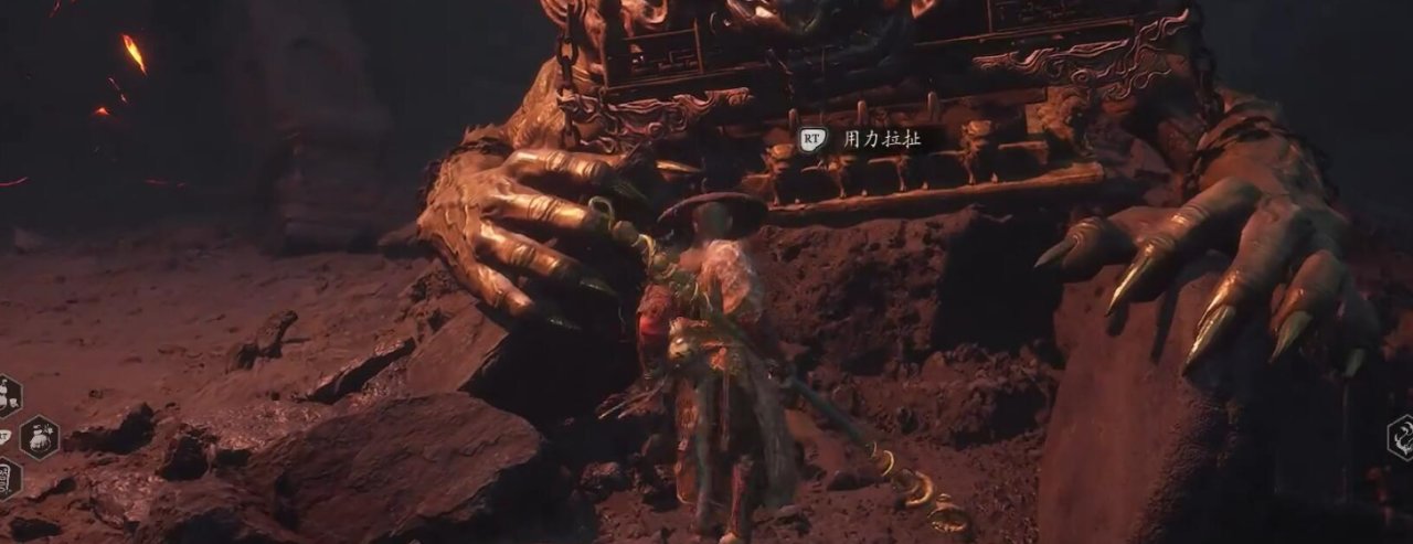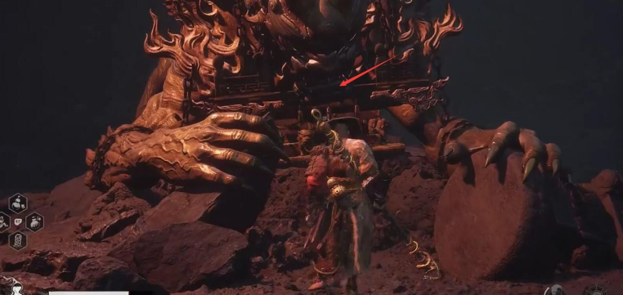 在土地庙旁的岩浆旁,往前走看到一个雕像,与其互动后去打boss【火焰山土地】