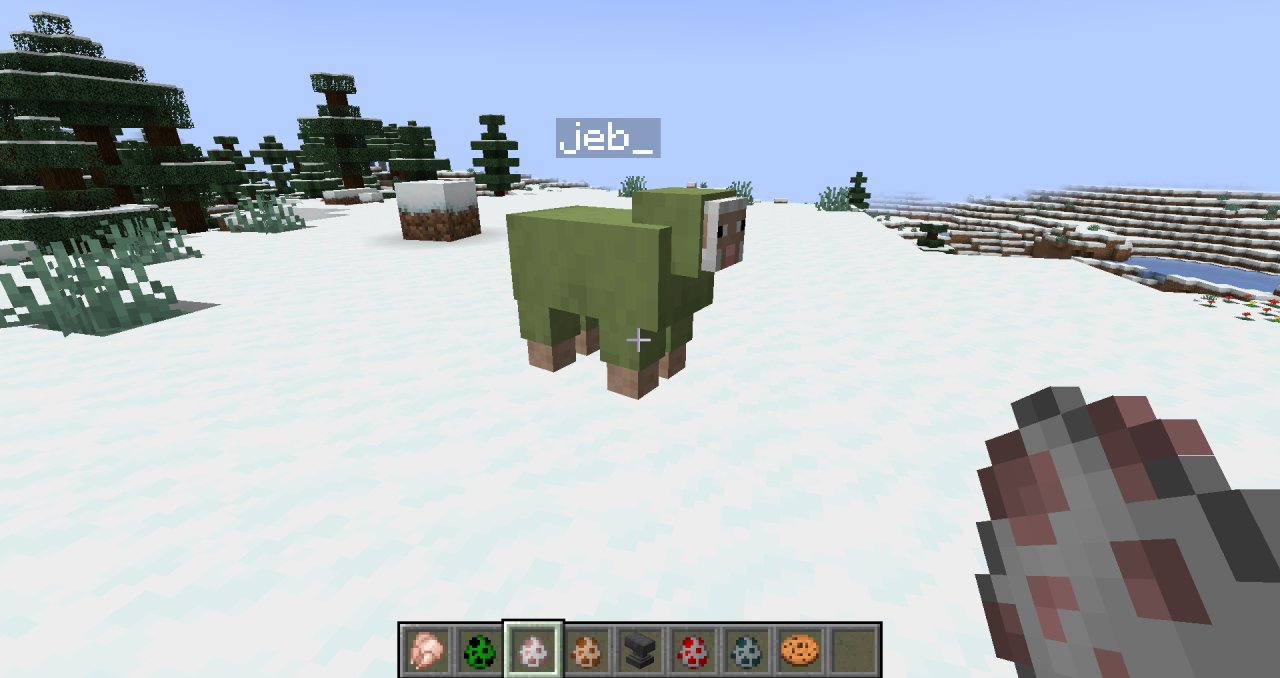 將羊命名爲“jeb_”,羊毛會不斷變色,用剪刀剪掉後會掉落原本顏色的羊毛。