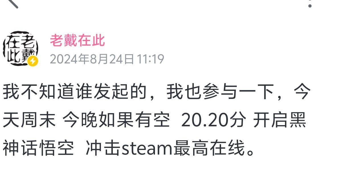 這幾天以來各大《黑神話:悟空》社區裏一直都有着這樣的聲音,而在今天,一些玩家終於坐不住了,開始發帖呼籲大家在今晚啓動《黑神話:悟空》,來衝擊Steam最高在線人數