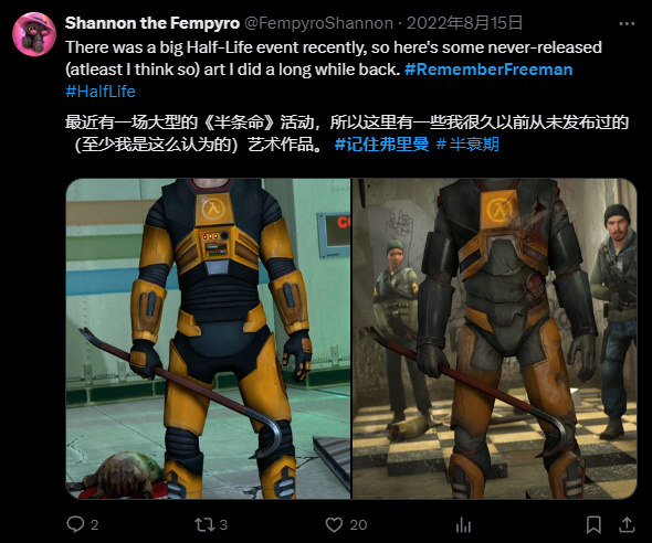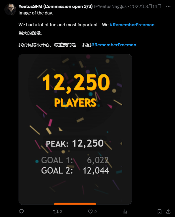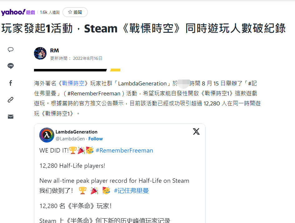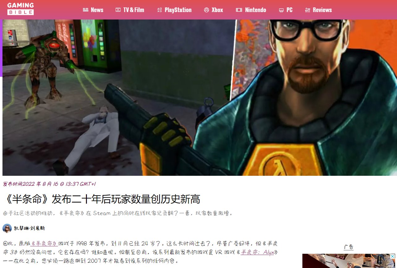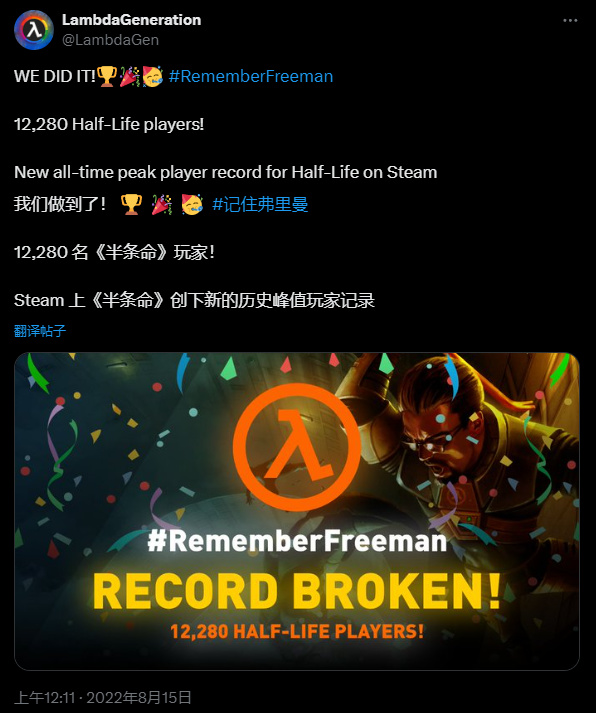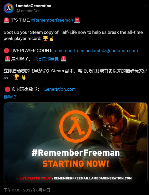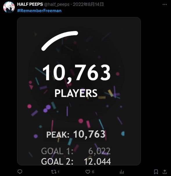 2022年的時候,他曾經發起過一個名爲“記住弗里曼”的活動,呼籲玩家們在8月14日同時打開“半條命1”這款遊戲,來衝擊這款遊戲的最高在線人數