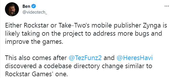 大V玩家猜測,開發商Zynga可能會接手該項目,以便修復bug並改善遊戲。R星母公司Take-Two於今年1月份以127億美元收購Zynga(國外社交遊戲巨頭),並大舉進軍手遊領域。