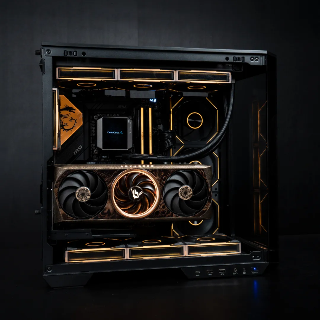 显卡竖装,金刚圆环的RGB灯效,设计灵感来源于法宝“金刚琢“,中间半透聚风扇叶可出现类似“视觉停留”的效果