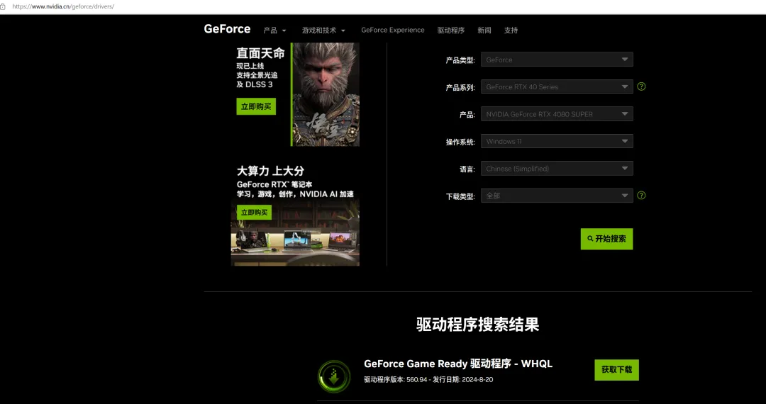 在开始测试前,先去NVIDIA官网下载8.20号更新显卡驱动,新版驱动对《黑神话:悟空》进行了优化。