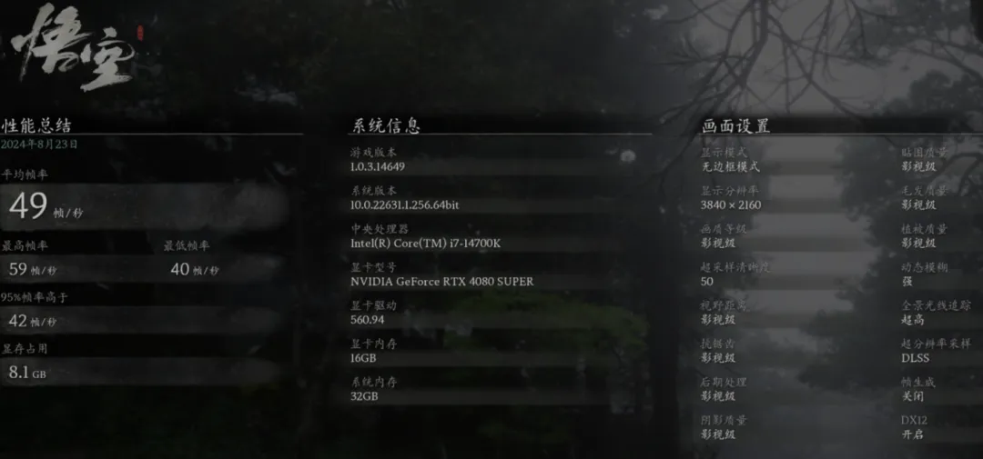 帧生成关闭,实测平均帧数49,最低40,最高59,95%帧率高于42帧