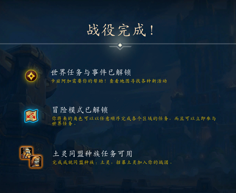 現在只要有一個號完成了當前主線,就解鎖了世界任務、冒險模式以及新同盟種族可用任務這些進度都是你戰團下面所有角色可共享的。