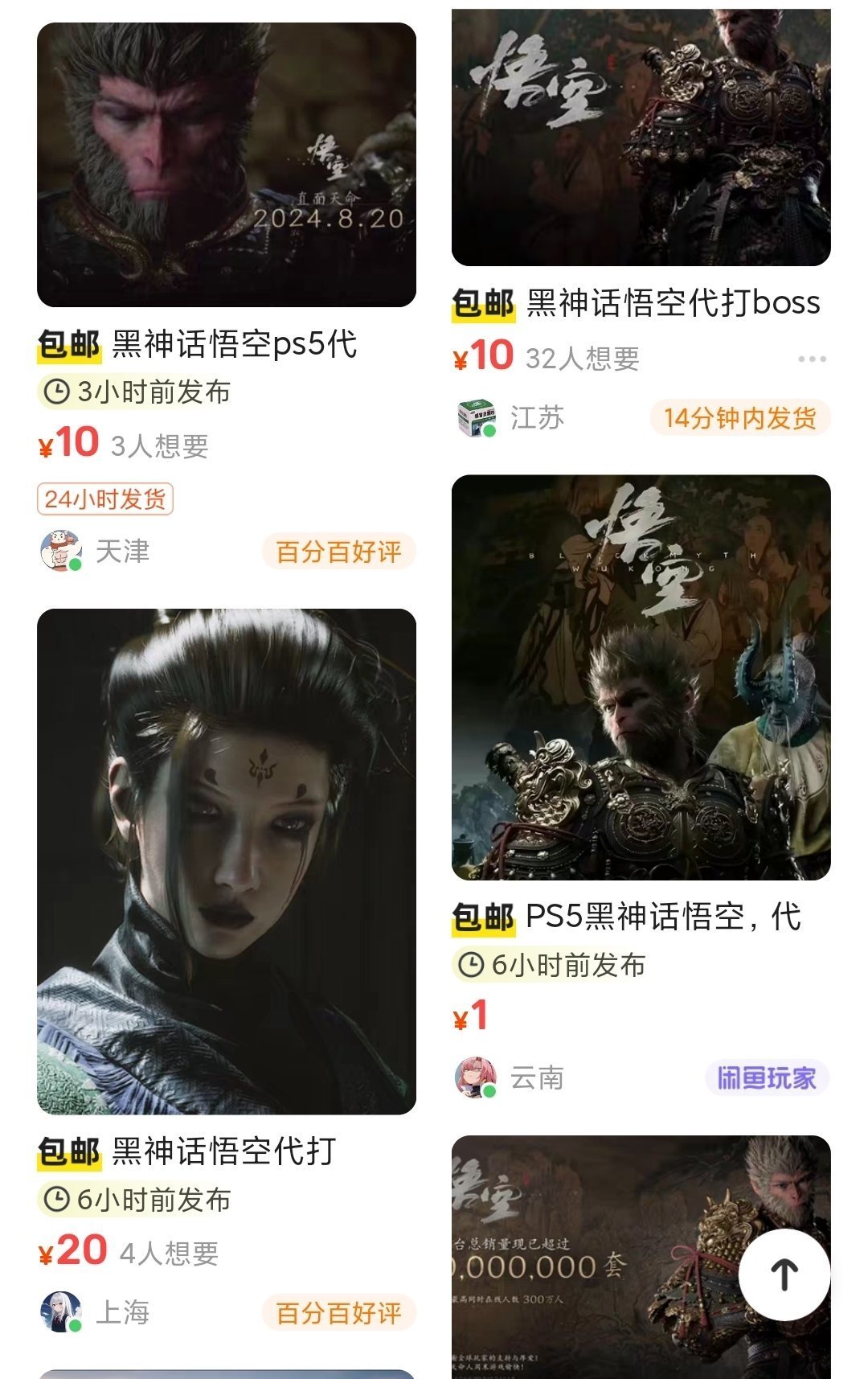 有人有求需,自然就有人需求。所以在閒魚上出現了大量的關於黑神話悟空的代練。有一些是代肝各種資源,還有一些也是代打各種boss,而且從其成交數量可以看出是有不少的市場。這次黑神話悟空有PC端和主機端,和PC電腦不同的是,PS主機不能使用修改器和各種mod。在主機上如果實在是操作不靈敏,是很容易卡關的。在之前《艾爾登法環》的時候就有了不少的代練。而且代練的價格也都在個位數,或許這也算是一種市場?