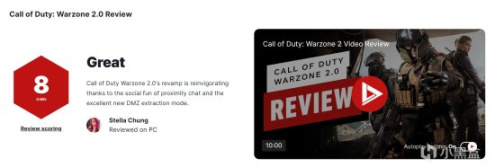IGN爲《使命召喚:戰區2》打出了8分的評分,得益於近點交流的社交樂趣和全新而又的DMZ模式,《使命召喚:戰區2》的改變使得遊戲重新煥發活力。