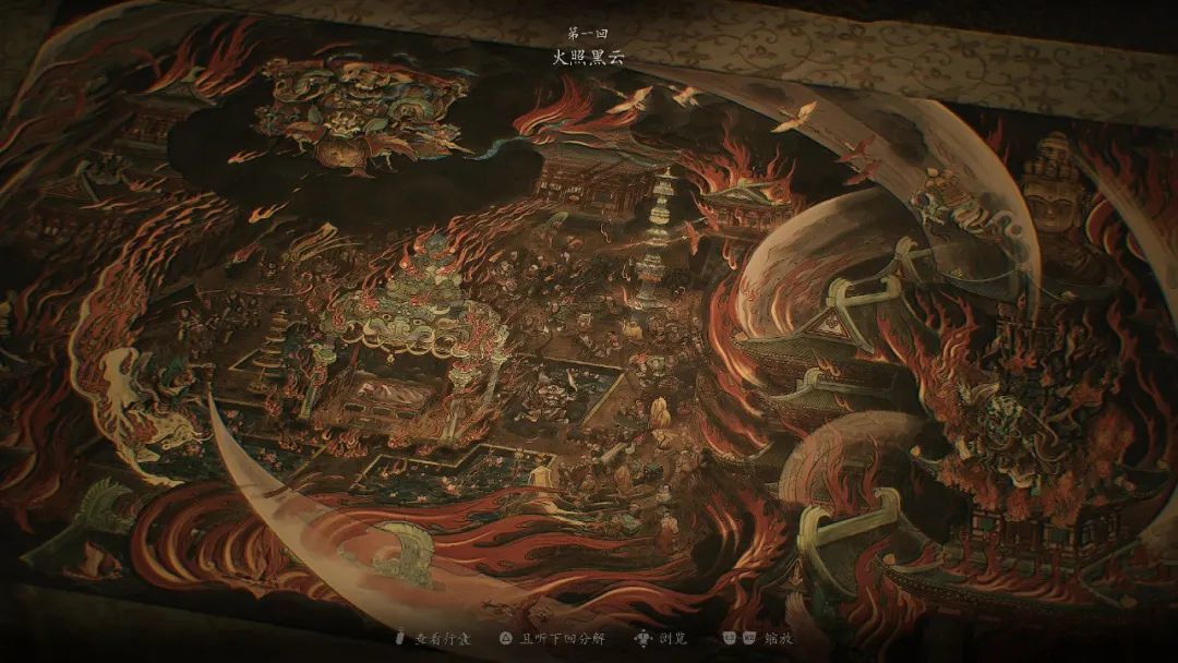 第二章的剧情则是在探讨人,佛,妖的善恶面。拨浪鼓支线,黄金国覆灭以及主线均和这个主旨深深联系。把额外的剧情背景全扔进影神图是个非常好的决定,让只想战斗爽的玩家不用看那么多字,让乐于钻研剧情的玩家能够更系统地欣赏并串联起故事与故事背景。本章的章末动画也是不错,定格动画让人眼前一亮。