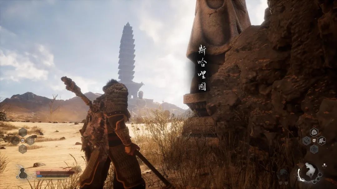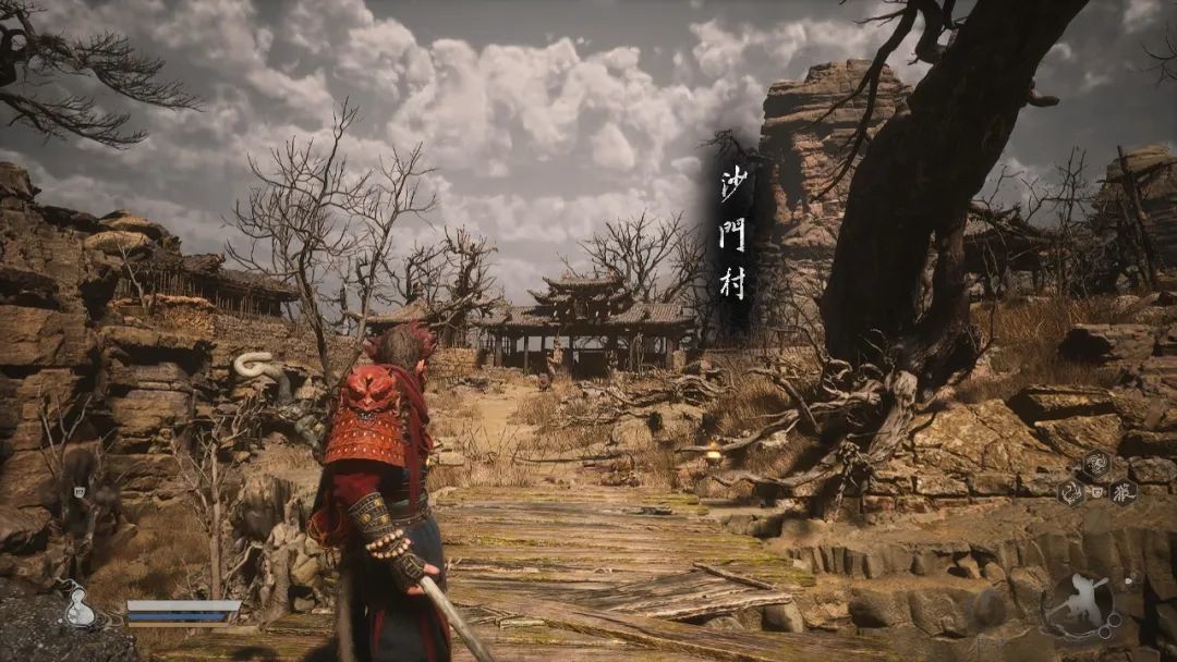 但黑神话的这个空气墙就有些怪了。一般箱庭的边界应该与实际美术表现结合起来:比如说坡度很高的石壁,比如说阻挡前行的树干,让玩家一目了然。但第二章里充斥着各种不明显的边界:不能走的斜坡,不能跳下去的高地,如此种种。而隐藏支线往往需要玩家去乱闯乱探,这种空气墙设计带来的探索挫败感有点强。
