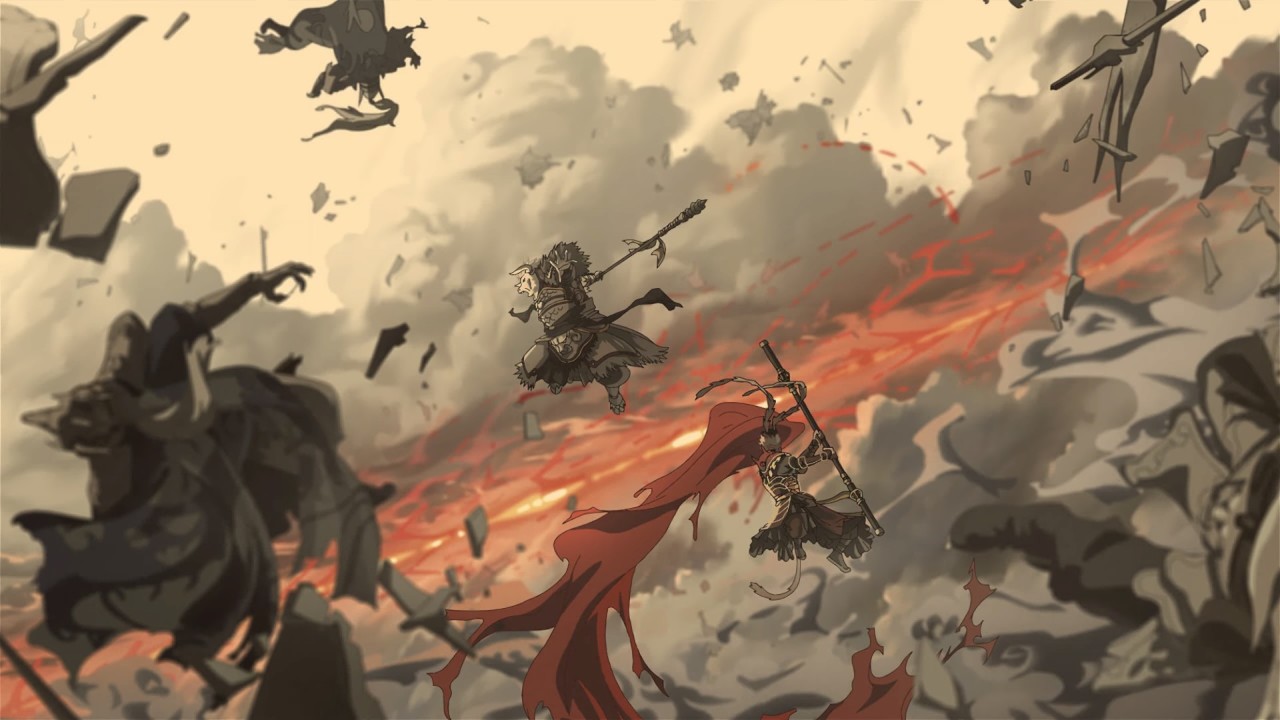 西行歸來,孫悟空欲歸花果山,卻遭天庭阻撓,怒而攻天,但是最終身裂六處,散落人間,化爲“六根”。