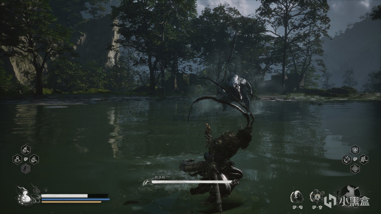 體驗及解析:跳浪蛟位置在望犀坡土地廟附近的水池裏面,位置標記出來給大家。跳浪蛟主要是掃尾很痛,它潛水的時候注意閃避就行,開局進去先翻滾一下,因爲他會突然跳出來。打完會獲得闢水珠(不是法寶,在水面上戰鬥會增加防禦力)。