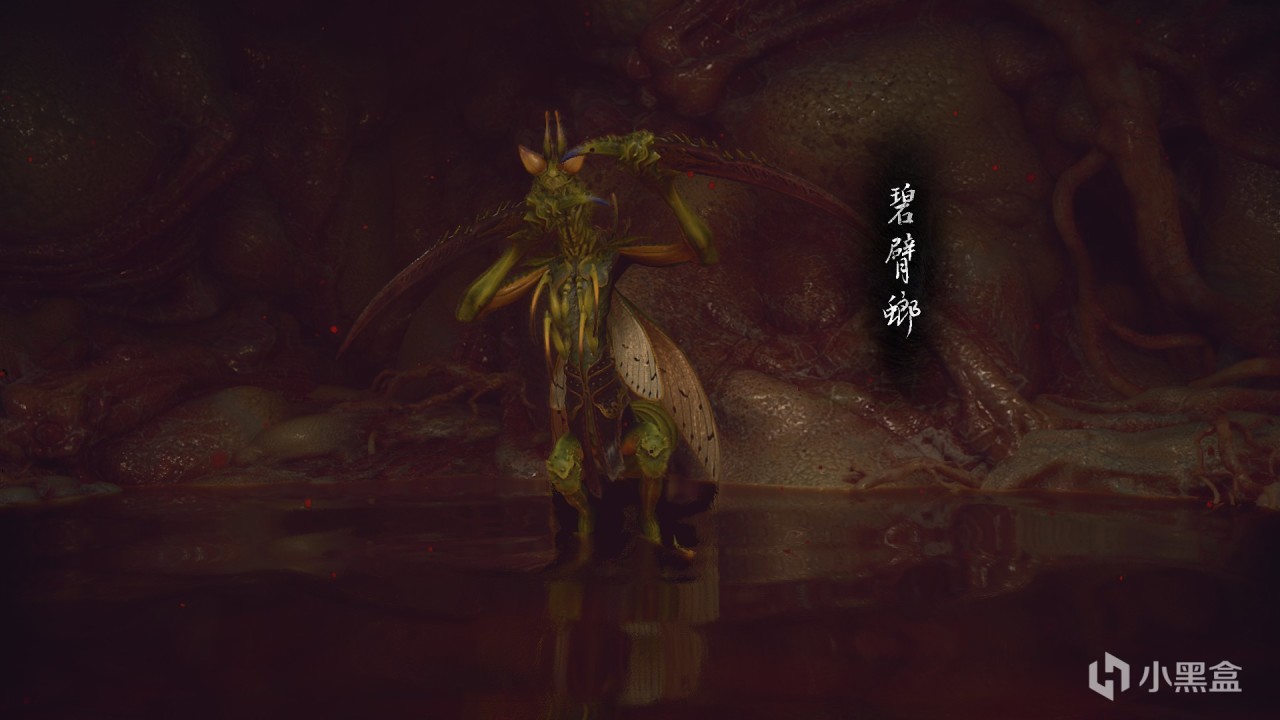 體驗及解析:位置在捕螂汀往前走,觸發動畫豬八戒被螳螂偷襲,直接進肚子裏面打,這裏很搞笑,大家自己體驗吧哈哈。碧臂螂有兩個階段,但是隻有一條血管。一階段沒啥難,二階段會帶上血刃傷害變高,並且攻擊頻率變快,都是快刀,多翻滾就行。打完給大聖的點翠飛龍釬(han第四聲)。