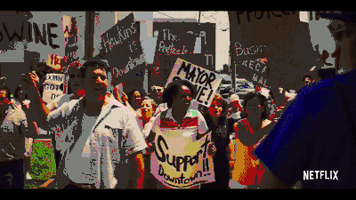 不仅如此,80年代以娱乐至上的消费主义,更是推动了资本商业化的重大一步,比如在第三季里,由于大型商场的出现,人们开始依赖于商场中眼花缭乱的各种元素,电影院、甜品店、瑜伽室、电玩城应有尽有,同时人们也终于得以在一个充满众多视野的娱乐场所里一举展现自己的风骚,一时间各大小超市面临破产,虽然他们极力游行,但失业人群的抗议终究还是被群众与资本家娱乐的声音所盖过,资本的崛起已是必然。