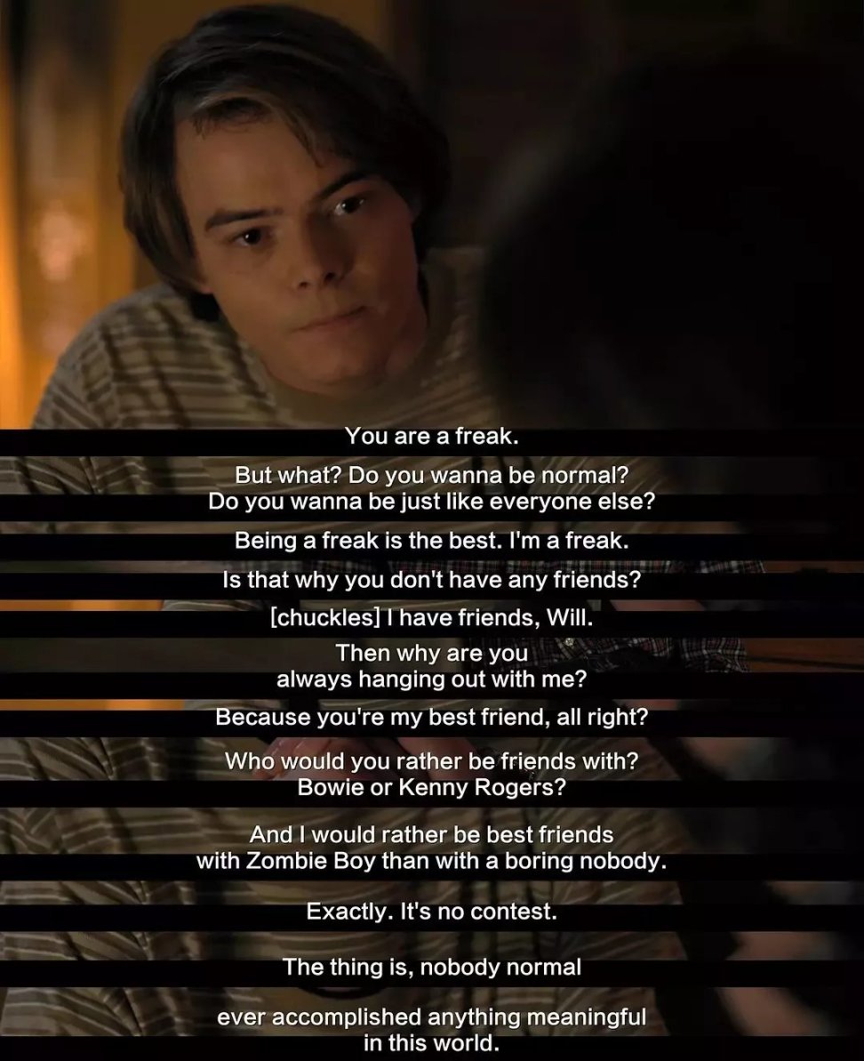 人生是动态且永不停息的,人性是复杂而非黑白分明的,《怪奇物语》所体现的就是这一点,即使是再痛恨世界的恶人也会因一段美好的过往而痛改前非,即便是不在乎生死的绝情之人也会因朋友的呐喊而努力奔跑。