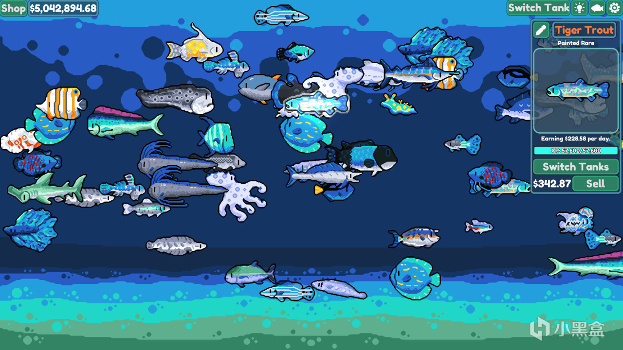 养鱼模拟器,通过初始三种纯色鱼开始不断配种,诞生各种斑点纹路的杂交鱼乃至全新颜色的纯色鱼,满足图鉴的苛刻要求并解锁新的收集目标。有晴雨变化,也可以单纯休闲挂机当屏保。适合打发时间,或者干脆在上班的时候光明正大摸鱼?