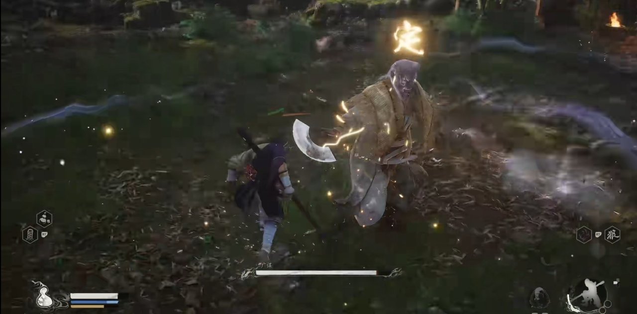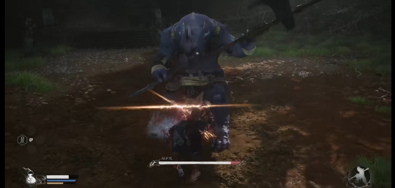 这个小头目是第一个拦路boss,咱们的定身术也是在这里学会的,该头目擅长使用大斧进行前摇过大的攻击,到后面甚至都只能算得上精英怪了,只需要躲过几次攻击,用几段蓄力棍击差不多就能打败,实在不行,就靠拉扯,用定身术后再来打。