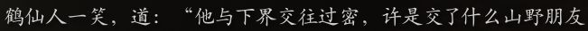 而鶴仙人可能是太上老君的祕書/坐騎/小分身之類的玩意,因爲他稱呼王母娘娘爲“她老人家”,但官位比王靈官高不少,同時隨意嘲諷晦月魔君。