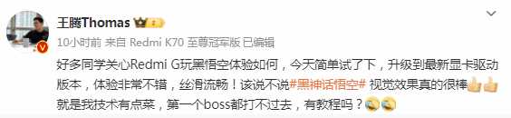 而Redmi品牌總經理王騰曾表示:《黑神話:悟空》視覺效果真的很棒,就是自己技術有點菜,第一個boss都打不過去,想求個教程。