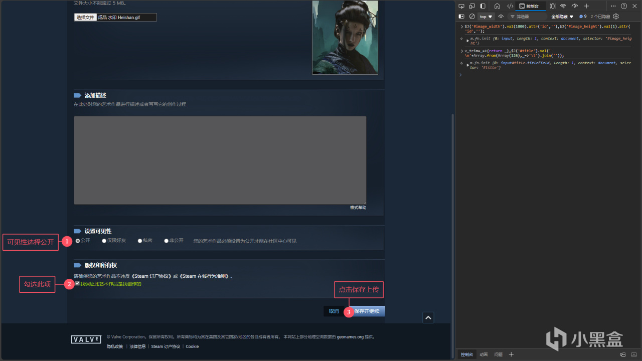 四、可見性選擇公開,勾選“我保證此藝術作品是我創作的”,點擊保存並繼續上傳即可