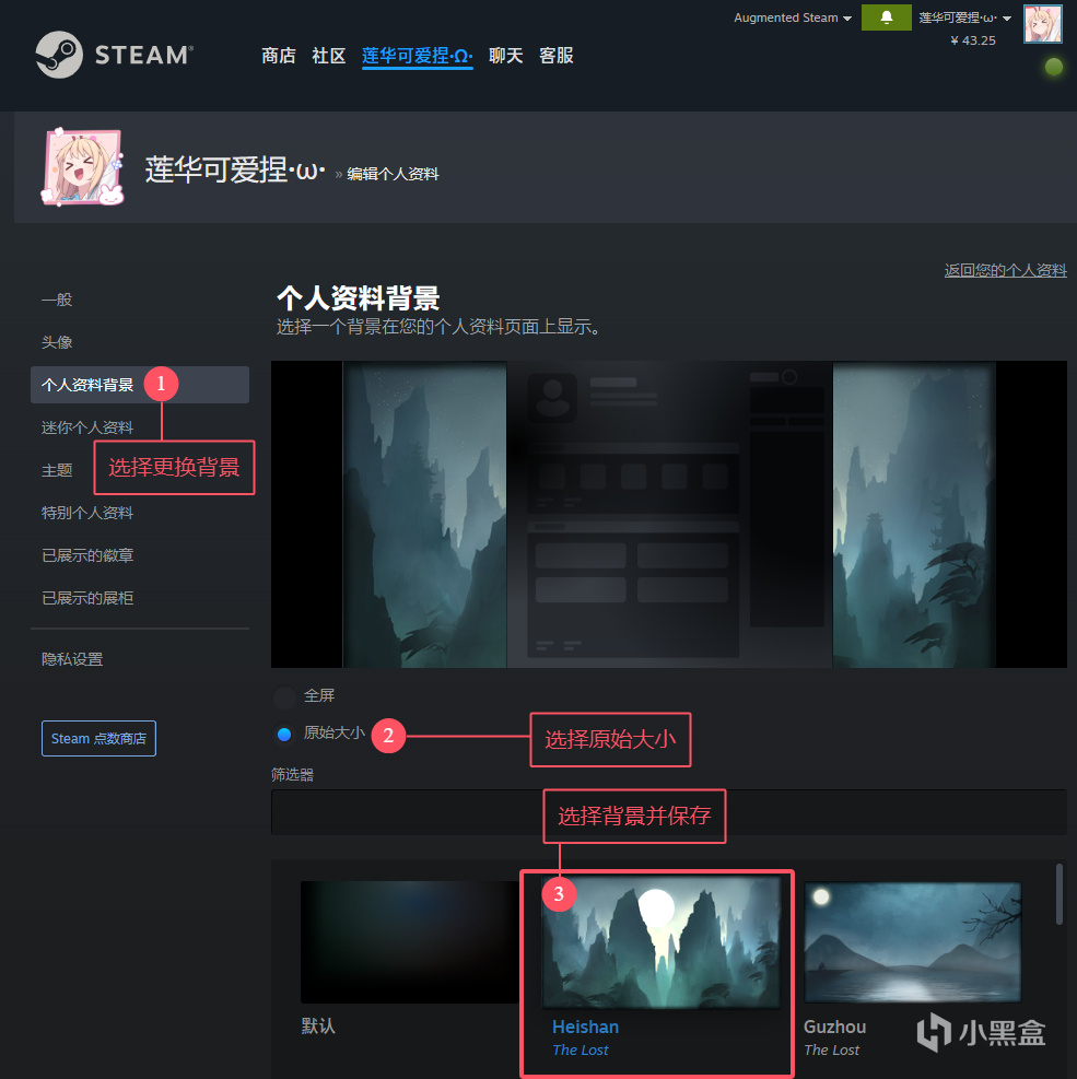 六、編輯steam個人資料,選擇個人資料背景,更換我們之前購買的背景(切記選擇原始大小),然後保存