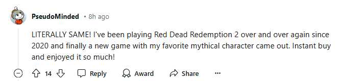 這篇文章也引起了不少國外網友的共鳴,有玩家表示:“真的一樣!自2020年以來,我一直在反覆玩《荒野大鏢客2》。現在終於有一款我最喜歡的神話角色的新遊戲問世了,我立刻就買了,非常喜歡!”