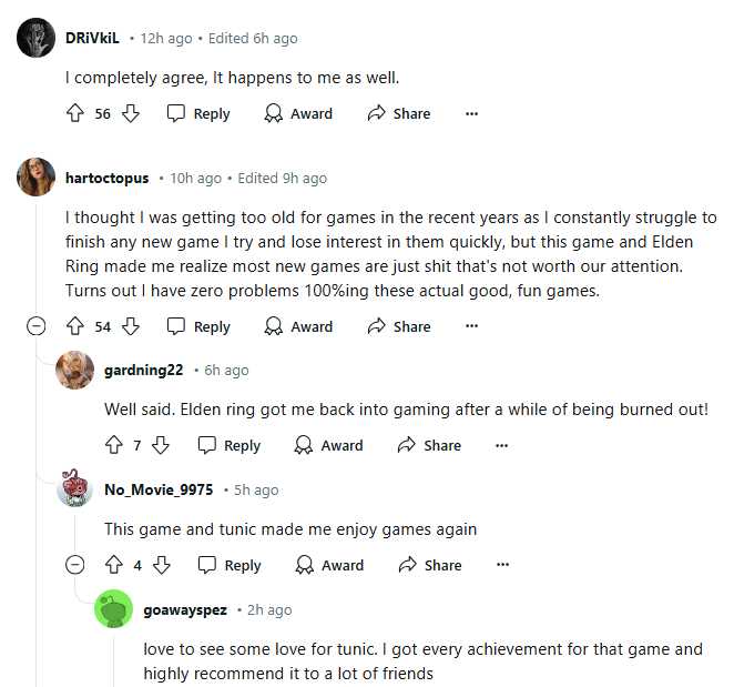 還有玩家表示:“最近幾年,我一直在努力完成我嘗試新遊戲,但很快就對它們失去了興趣,所以我以爲自己對遊戲已經太老了,但這款遊戲和《艾爾登魔戒》讓我意識到,大多數新遊戲都是垃圾,不值得我們關注。事實證明,我100%玩完這些真正好玩的遊戲毫無問題。”