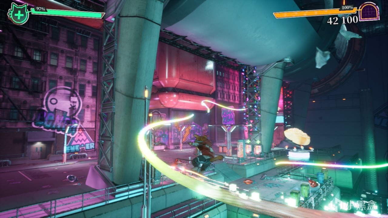 跑酷当我们经过竖直的广告牌或者高速滑道时,都可以高效的补充电力——加上游戏中存在大量的远程敌人,虽然我们有格挡正面伤害的护盾(不能一直用,会盾碎),所以用各种跑酷来规避伤害或者对特定敌人打击弱点(比如放电的怪物需要锤头)也是很有必要的。
