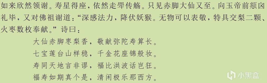 一席筵宴已畢,壽星告辭。那國王又近前跪拜壽星,求袪病延年之法。壽星笑道:“我因尋鹿,未帶丹藥。欲傳你修養之方,你又筋衰神敗,不能還丹我這衣袖中,只有三個棗兒,是與東華帝君獻茶的,我未曾喫,今送你罷。國王吞之,漸覺身輕病退。後得長生者,皆原於此。八戒看見,就叫道;“老壽,有火棗,送我幾個喫喫。”壽星道:“未曾帶得。待改日我送你幾斤。