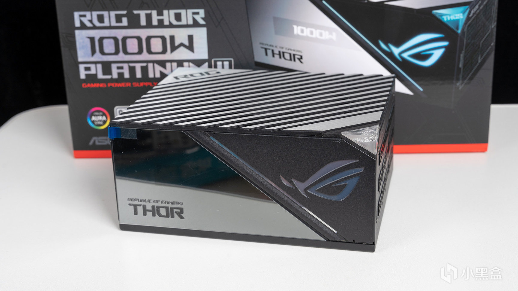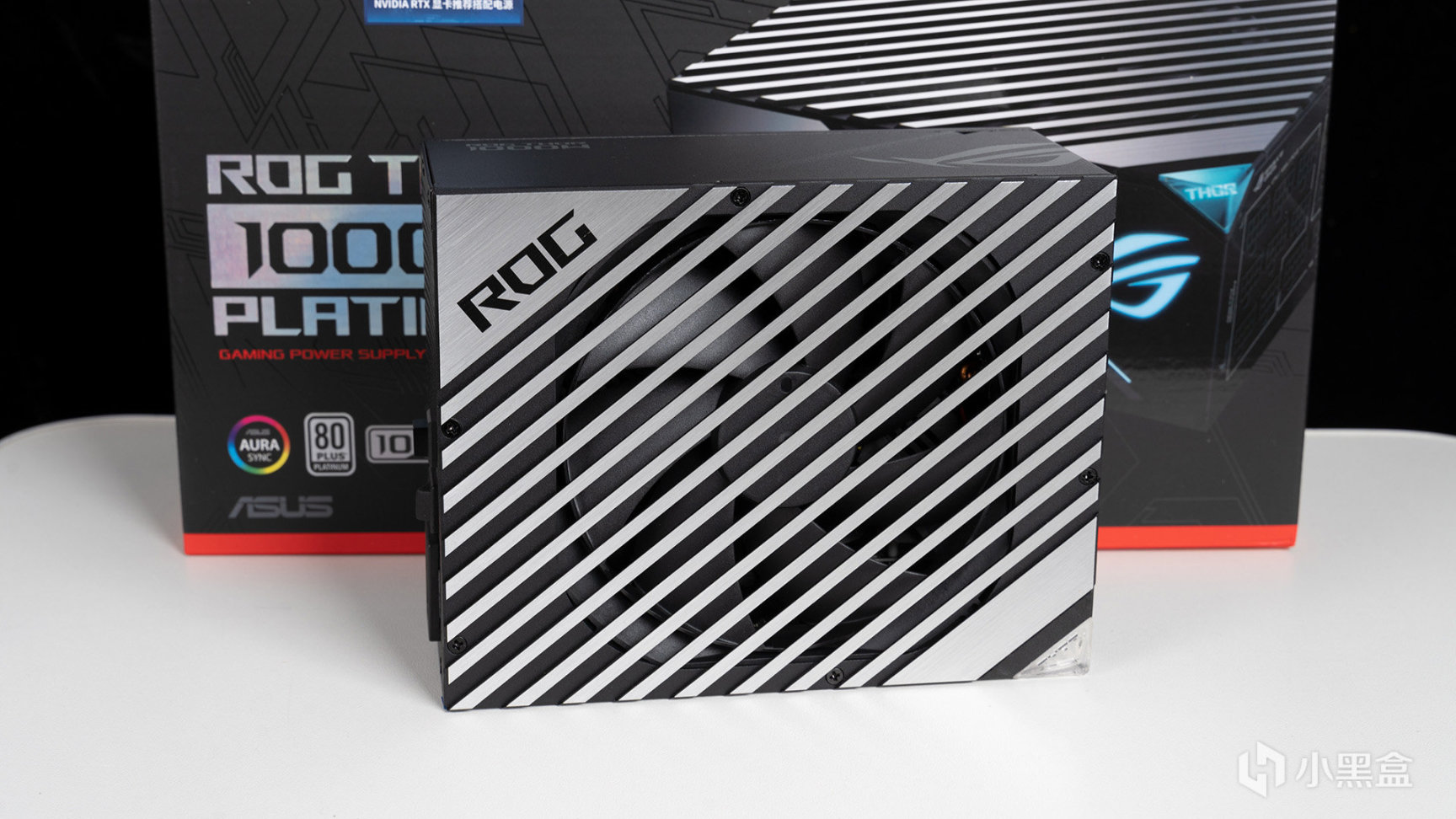ROG雷神二代1000W正面设计也是亮眼,装配斜纹式铝合金拉丝处理,风扇就是由此进风的,不过这种设计装机时还得多加注意,塞电源时很容易会刮花表面。