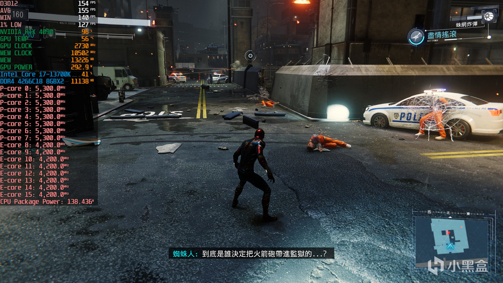 13700K+RTX4090+DDR4 4266 8GBX2,《漫威蜘蛛侠重制版》4K手动最高画质+最高光追+DLSS 3质量(开启补帧),平均帧数为155fps