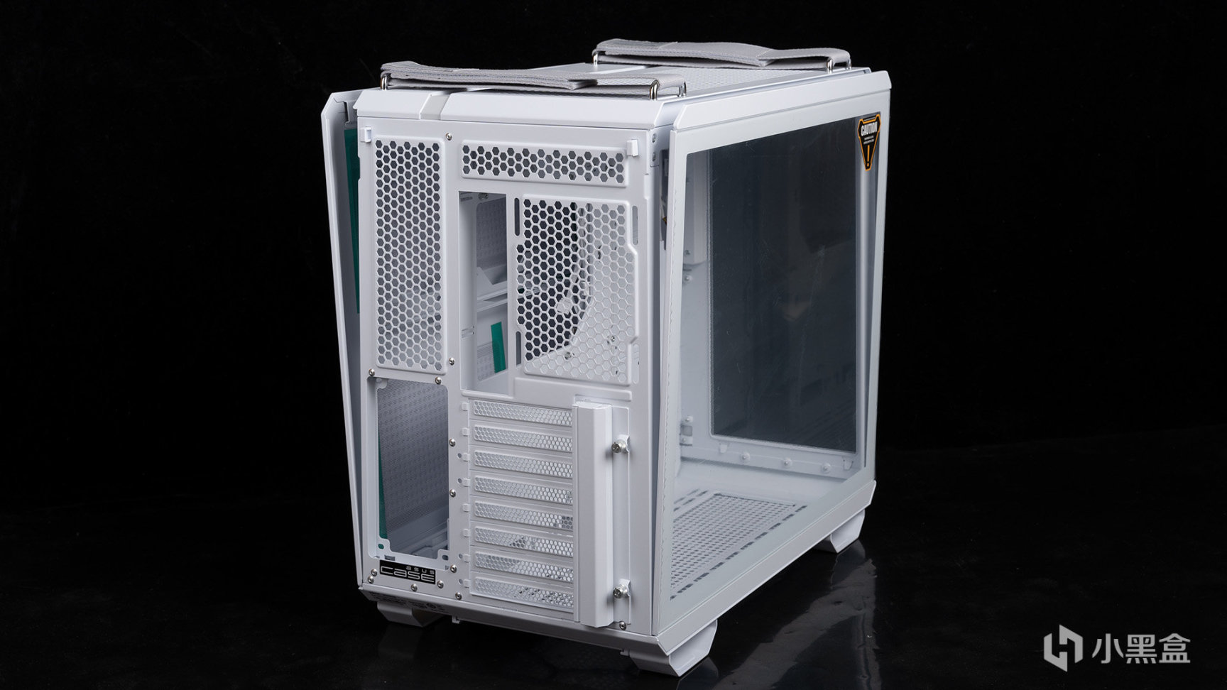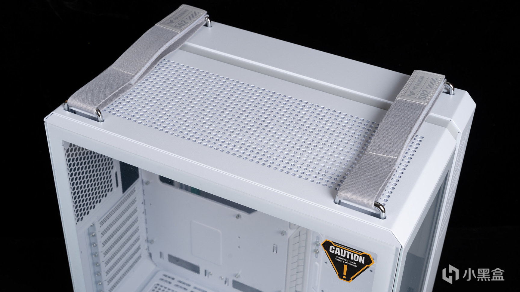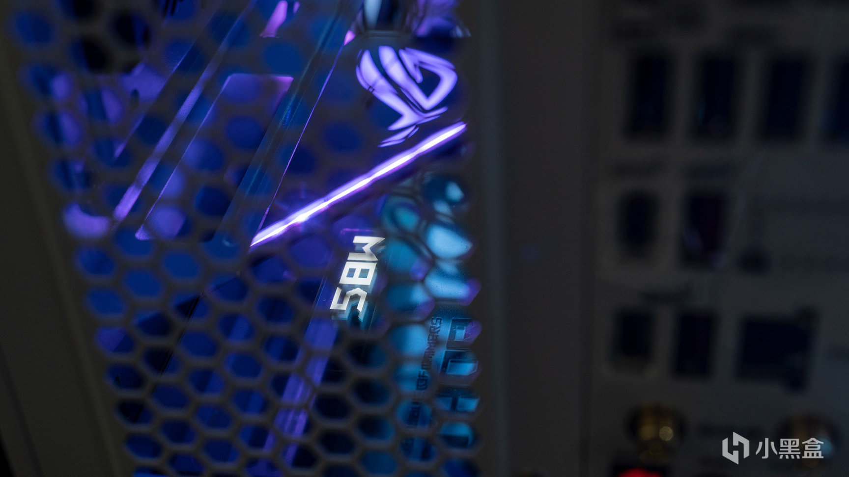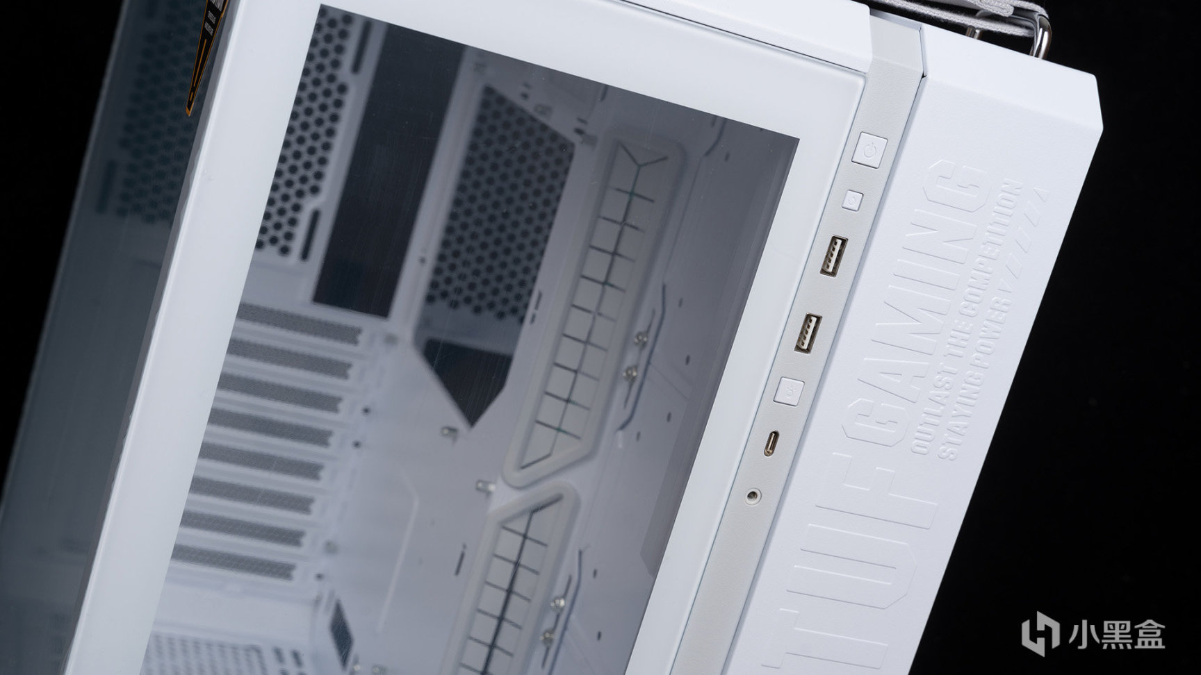 前面板的钢化玻璃也可拆卸,I/O接口除了常见的音频、USB Type A、USB Type C(10Gbps)和开关重启键以外,还拥有灯效调节按键(与AURA SYNC之间可相互切换)。