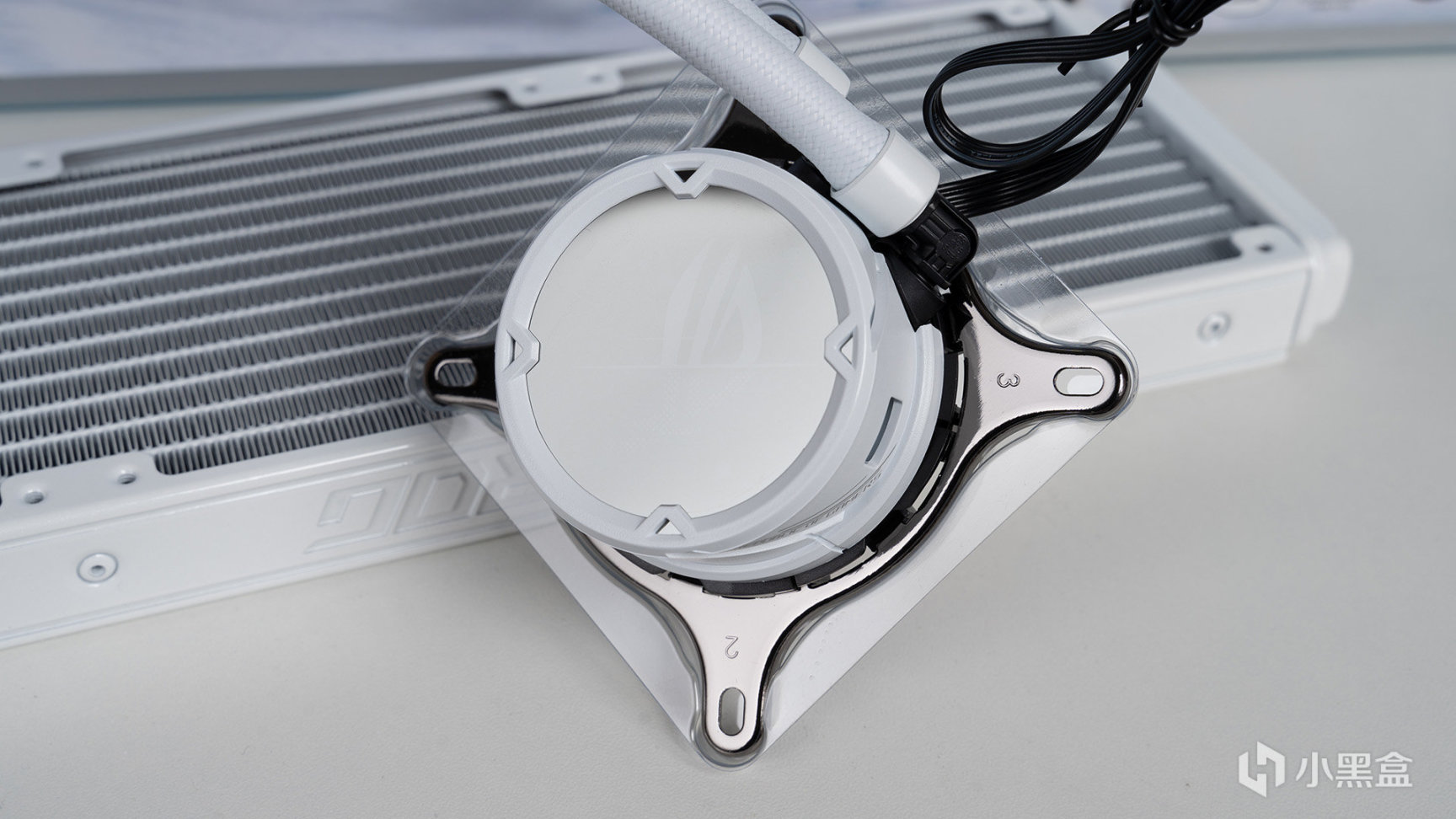 水冷头属于偏平的圆柱状设计,表面采用了一个镜面式的ROG LOGO,有一半还是像素化风格设计,不止如此外壳上有一些线条经过镂空设计,亮机后会比较特别,水冷头预装INTEL扣具和预涂一层硅脂。
