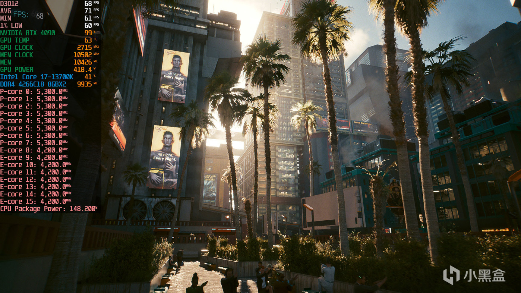 13700K+RTX4090+DDR4 4266 8GBX2,《赛博朋克2077》4K手动最高画质+最高光追+DLSS质量,平均帧数为71fps