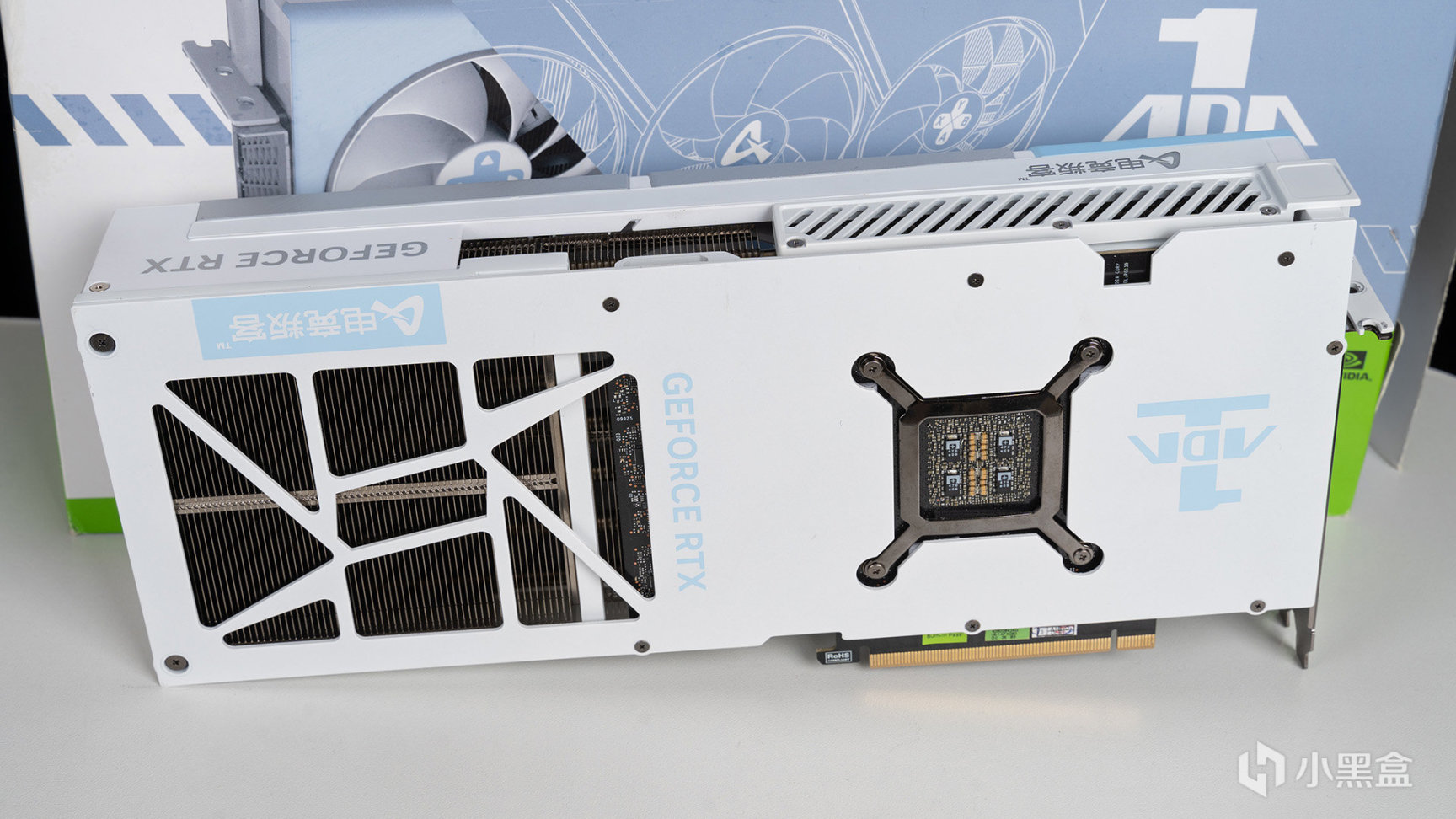 背面就是一块全覆盖的金属背板,同样元素也不多,有接近一半的面积是经过镂空处理的风道,显卡PCB也只有散热器一半左右长,加上本身大面积鳍片群、内置9根6mm热管以及VC腔均热板底座的结构,散热性能自然优秀,GPU核心之处也有额外支架加固。