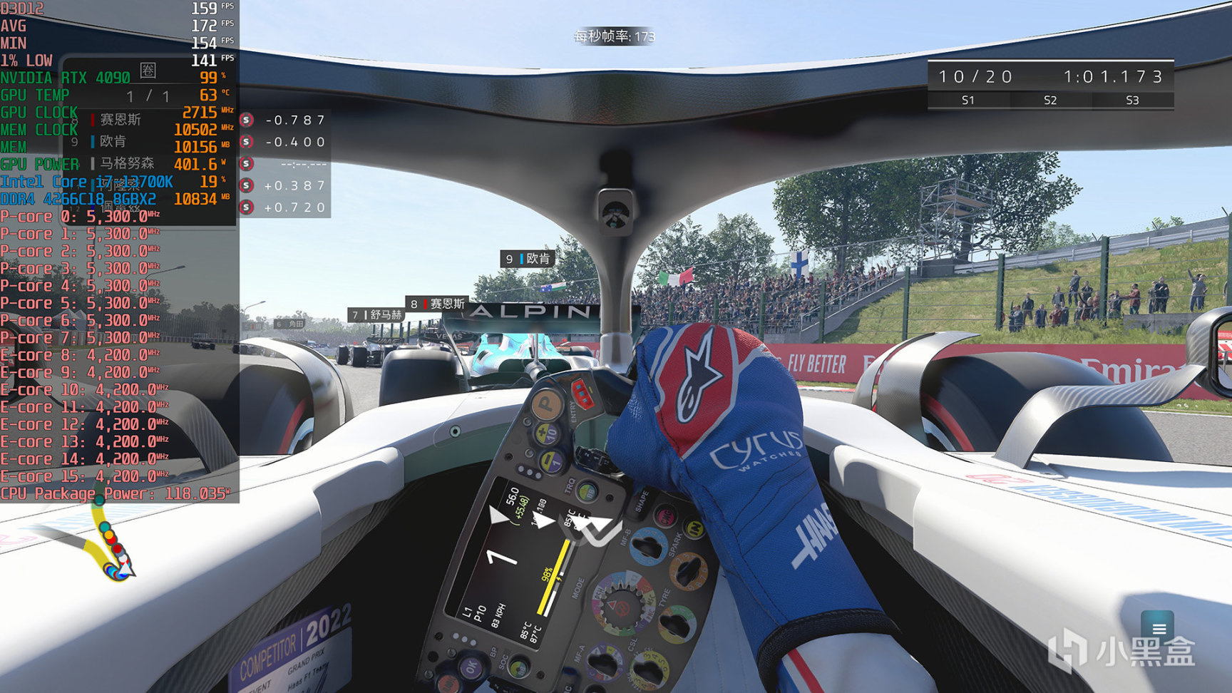 13700K+RTX4090+DDR4 4266 8GBX2,《F1 2022》4K手动最高画质+最高光追+DLSS 3质量(开启补帧),平均帧数为172fps