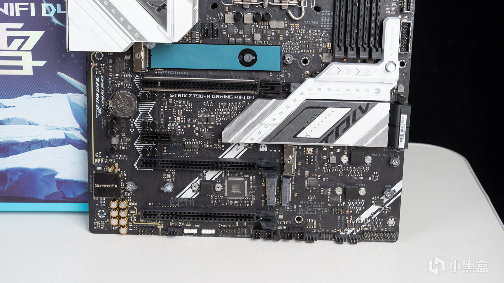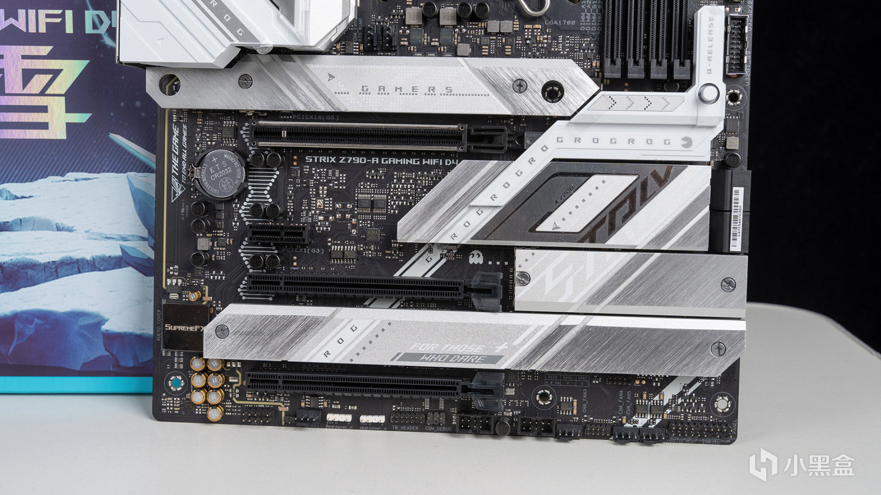 Z790 D4吹雪和上一代Z690在外观设计上有着异曲同工之妙,布局是差不多一致的,都是采用了大面积覆盖的金属马甲,并且表面有各种文字LOGO、拉丝、像素风格处理,个人觉得这次Z790 D4吹雪的外观设计,是整个华硕Z790产品线中最亮眼的,也难怪是主打款。