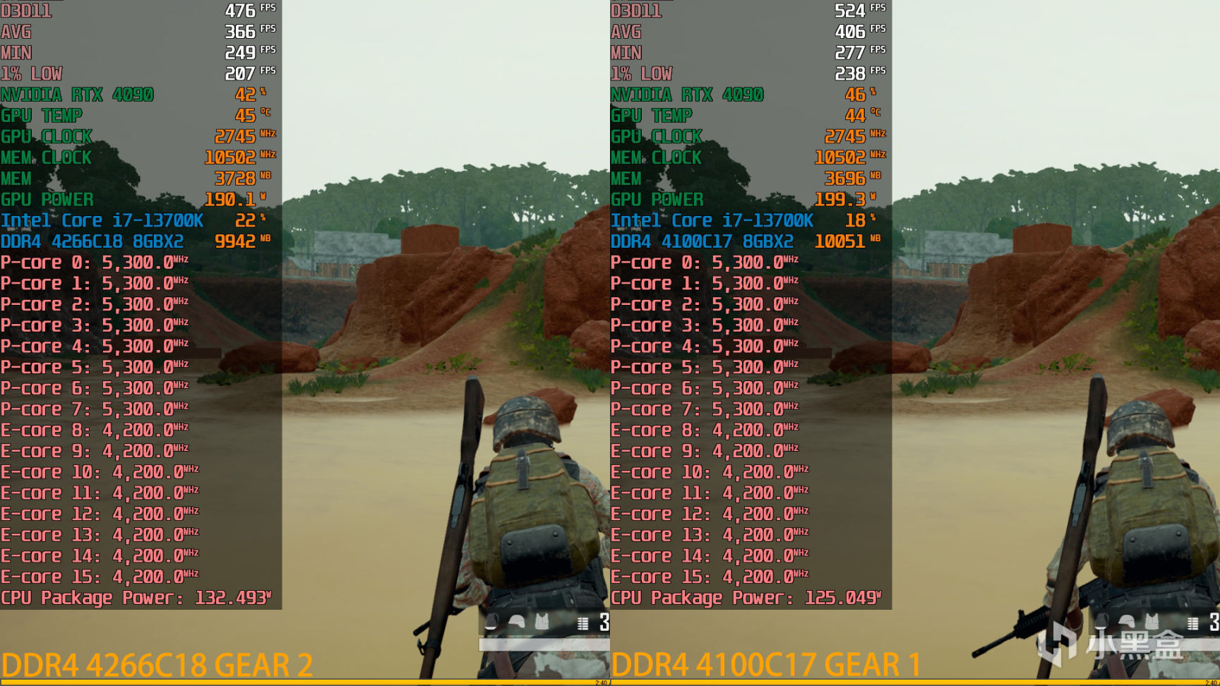 实际效果明显还是《绝地求生》这类高帧率电竞游戏,在1080P分辨率三超高画质下,DDR4 4266 Gear 2平均帧率为366fps,1% LOW帧率为207fps,而DDR4 4100 Gear 1平均帧率为406fps,1% LOW帧率为238fps,提升达到了可观的10%,对于1080P@360Hz显示器用户来说无疑是福音,帧数会更稳定,D4这方面的优势只要还是针对高帧率电竞玩家。