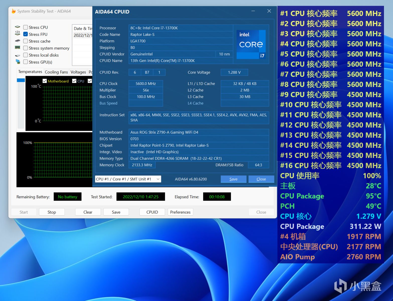 手上这颗13700K的SP分只有79,最终CPU超频结果一般,P核心可固定5.6GHz,E核心则是4.5GHz,核心电压1.28V,CPU Package温度升至95℃,CPU功耗达到恐怖如斯的311W,总得来说这套装机方案还是能压制住的。