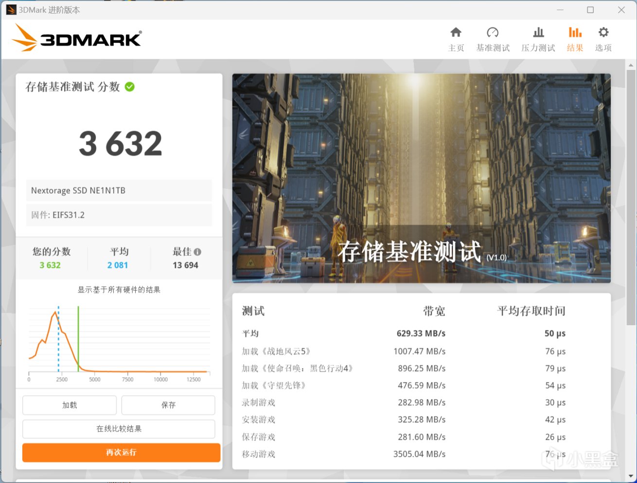 3DMark存储基准测试,这个项目是用来模拟SSD对于加载、安装、录制等多种游戏场景的表现,涉及《战地风云5》、《使命召唤:黑色行动4》和《守望先锋》三款游戏,NE1N1TB最终得分为3632,平均传输带宽为629.33 MB/s,平均存储时间50us,就是旗舰级GEN4固态的水平。
