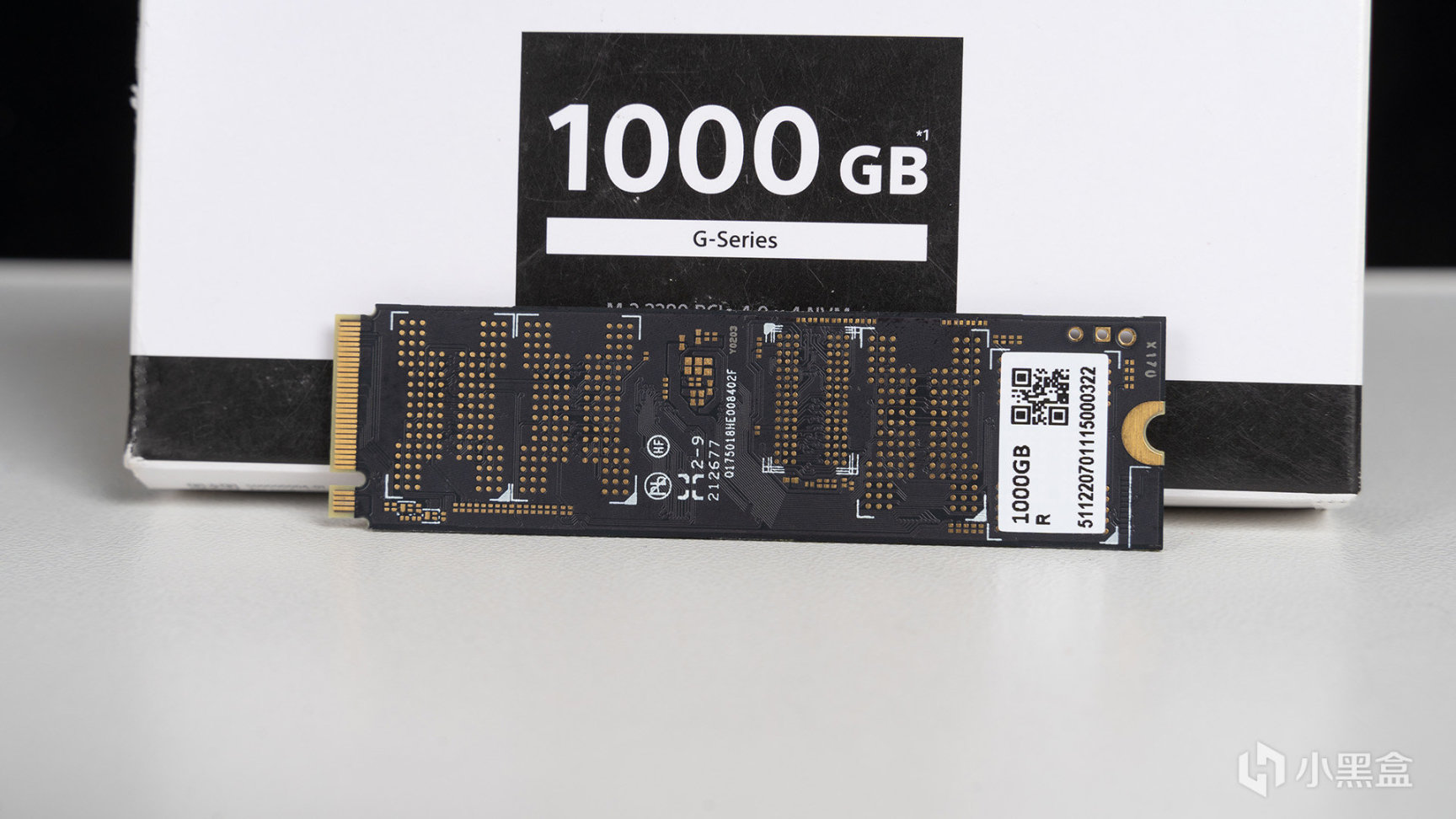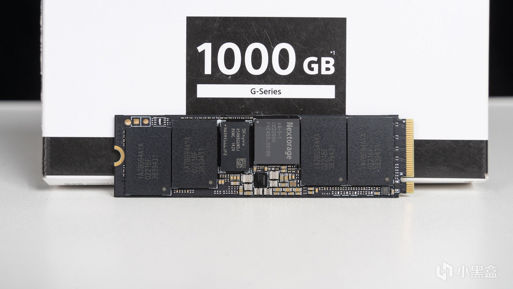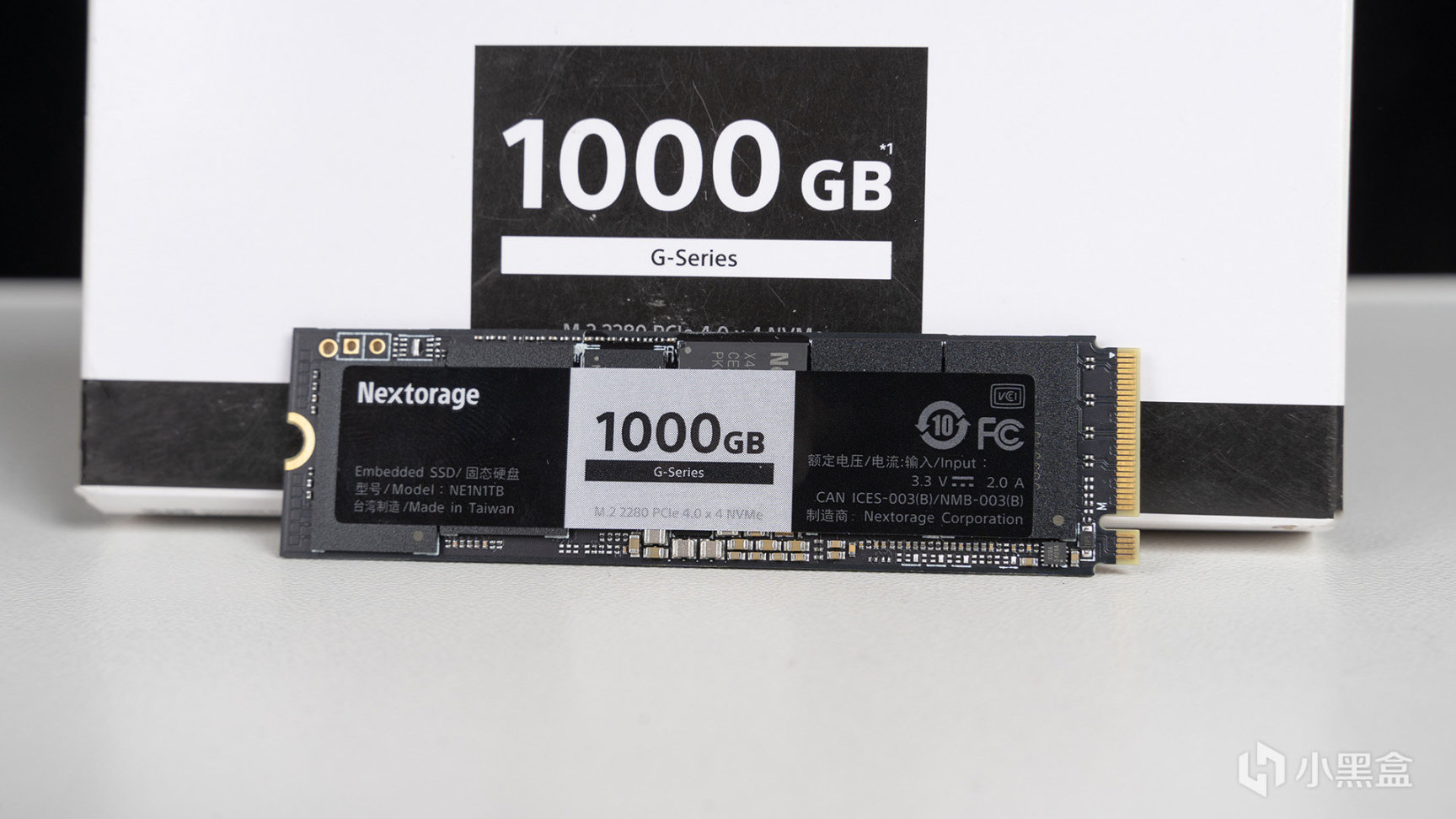 Nextorage G系列固态本体,标准2280长度M.2接口,手上这款是1TB容量的,除此之外还有2TB和4TB,正面贴有一张黑色铭牌贴纸,标注了型号、额定电压等信息,加装散热片的时候不需要撕下来,因为贴纸很薄不会对导热效果造成影响。