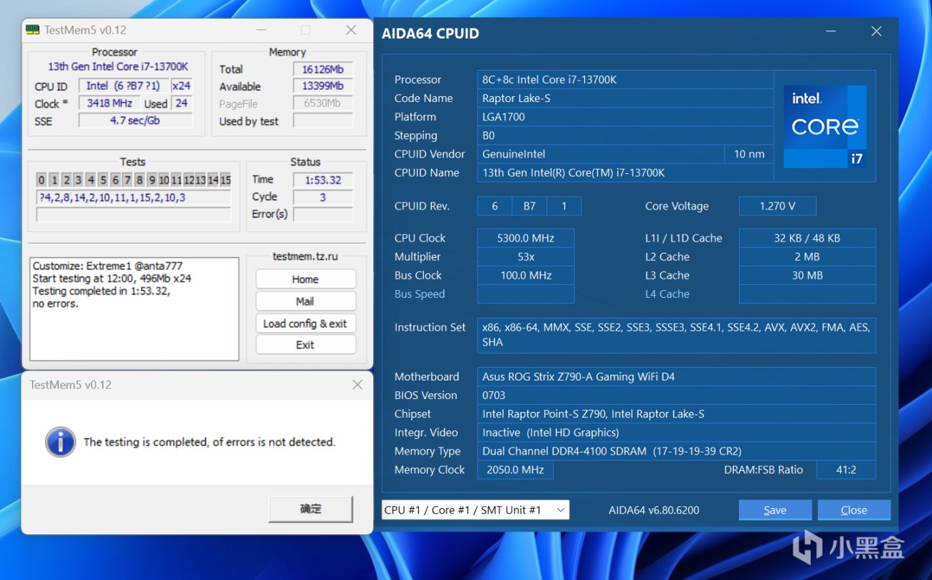 当然,朗科绝影DDR4 4266这套内存,采用的可是长鑫A-die颗粒,当然存在优化潜力空间,经过一番调试之后,最终设置内存参数为DDR4 4100 Gear 1(这颗13700K的IMC体质就到这里了),调整第一时序为17-19-19-39,tRFC 450,能通过接近两个小时@anta777配置的TestMem5烤机测试。