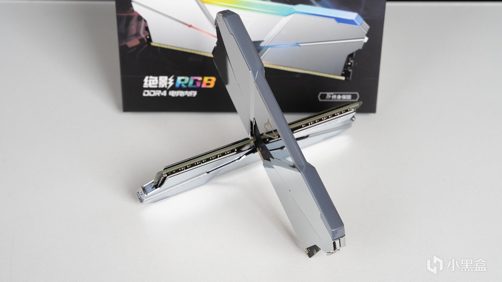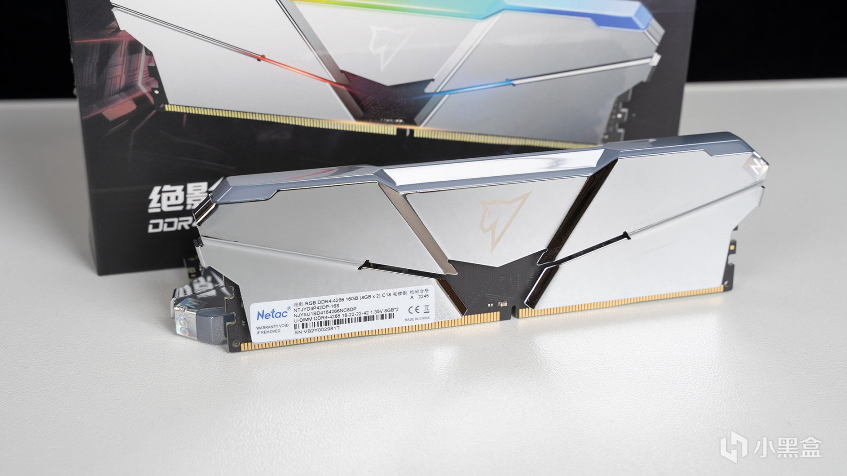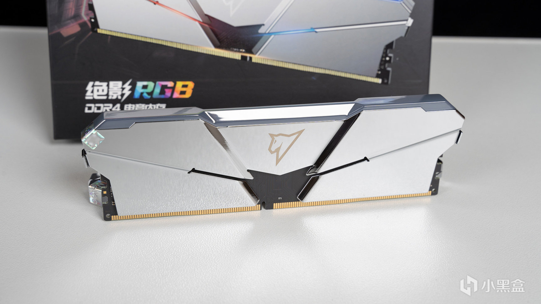 绝影DDR4 4266表面采用了电镀银工艺金属马甲,中间是一个丝印的绝影LOGO,除此之外还做了一些立体化和棱角处理,电镀银工艺好处就是可以间接反射机箱内的其他光源,缺点当然就是容易沾染指纹。
