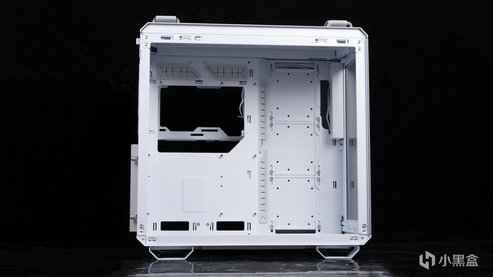 机箱内部一览,顶部、侧边(或者可安装三个硬盘)和右边均可以安装360冷排,也就意味着这些区域也可以按照风扇,加上尾部和底部的风扇位置支持,这款机箱想做到散热良好的一件很轻松的事情。